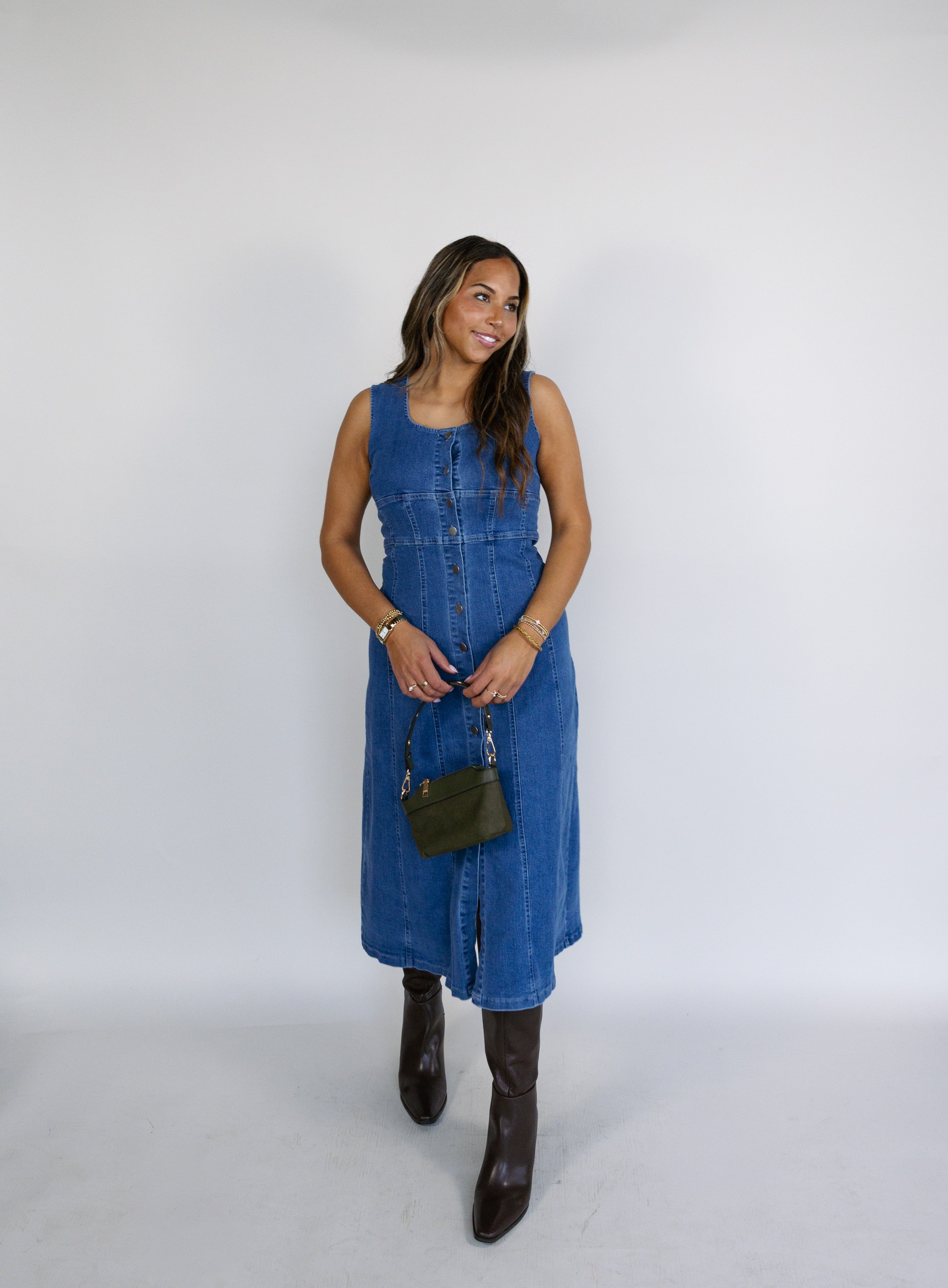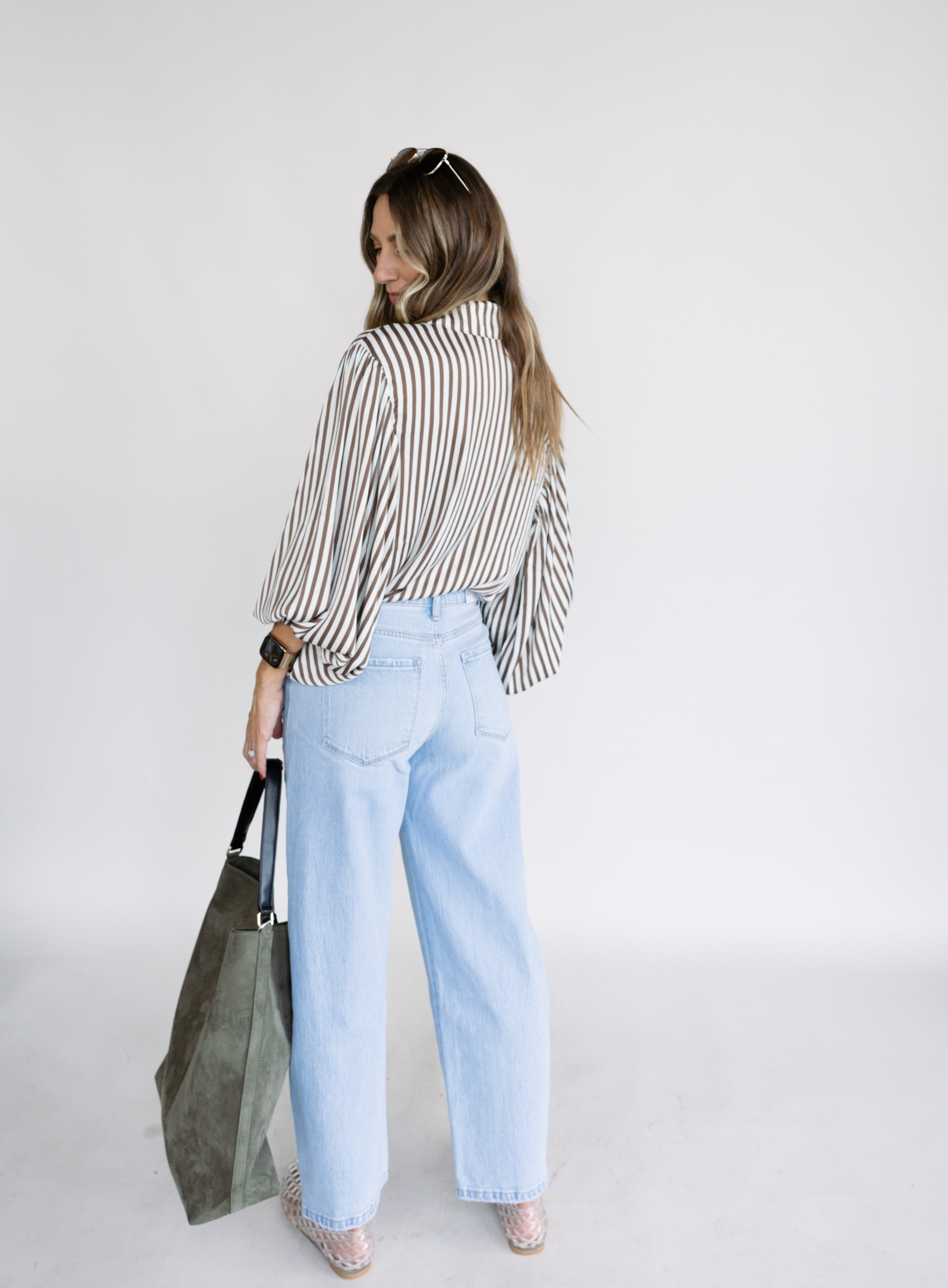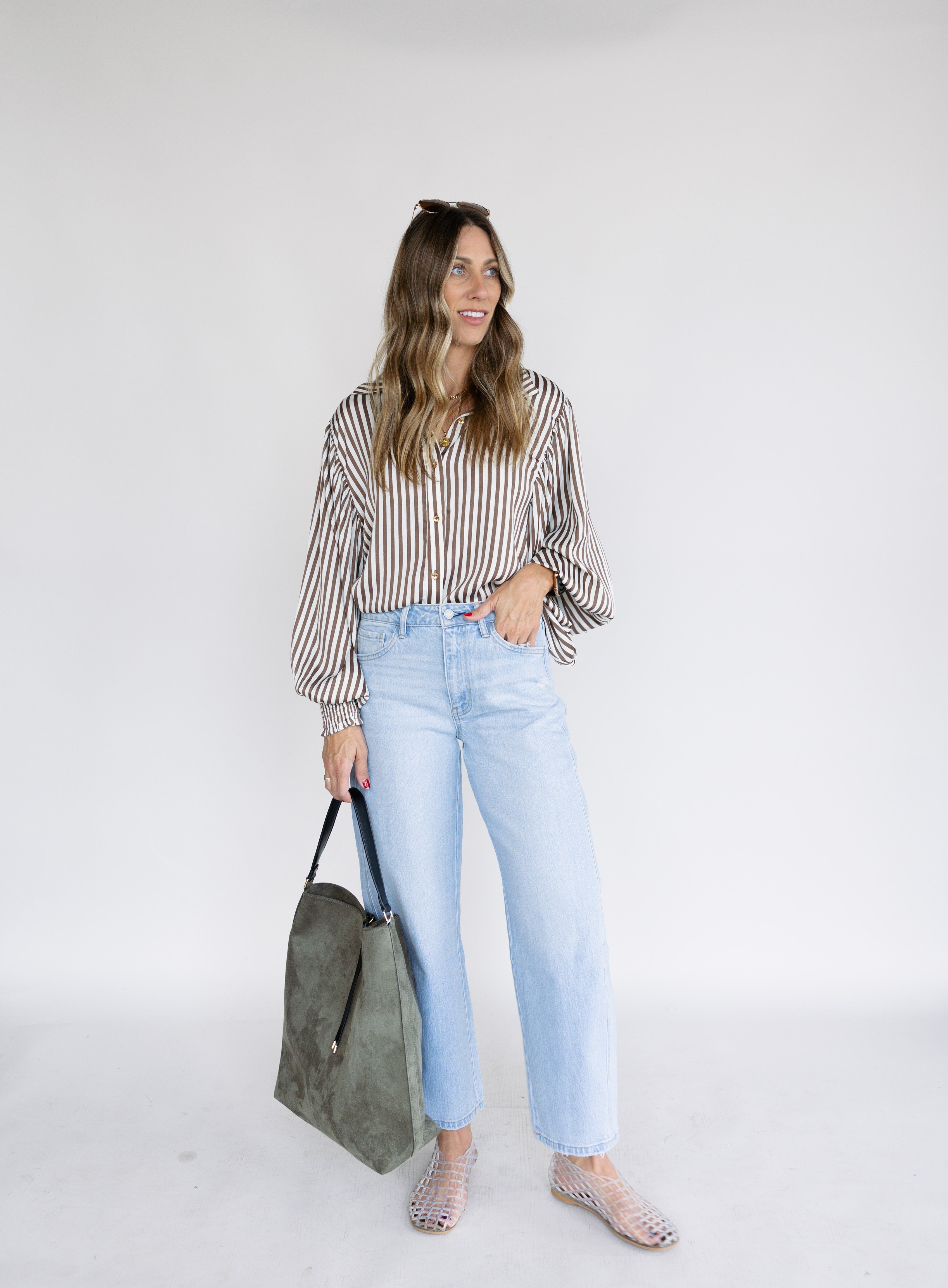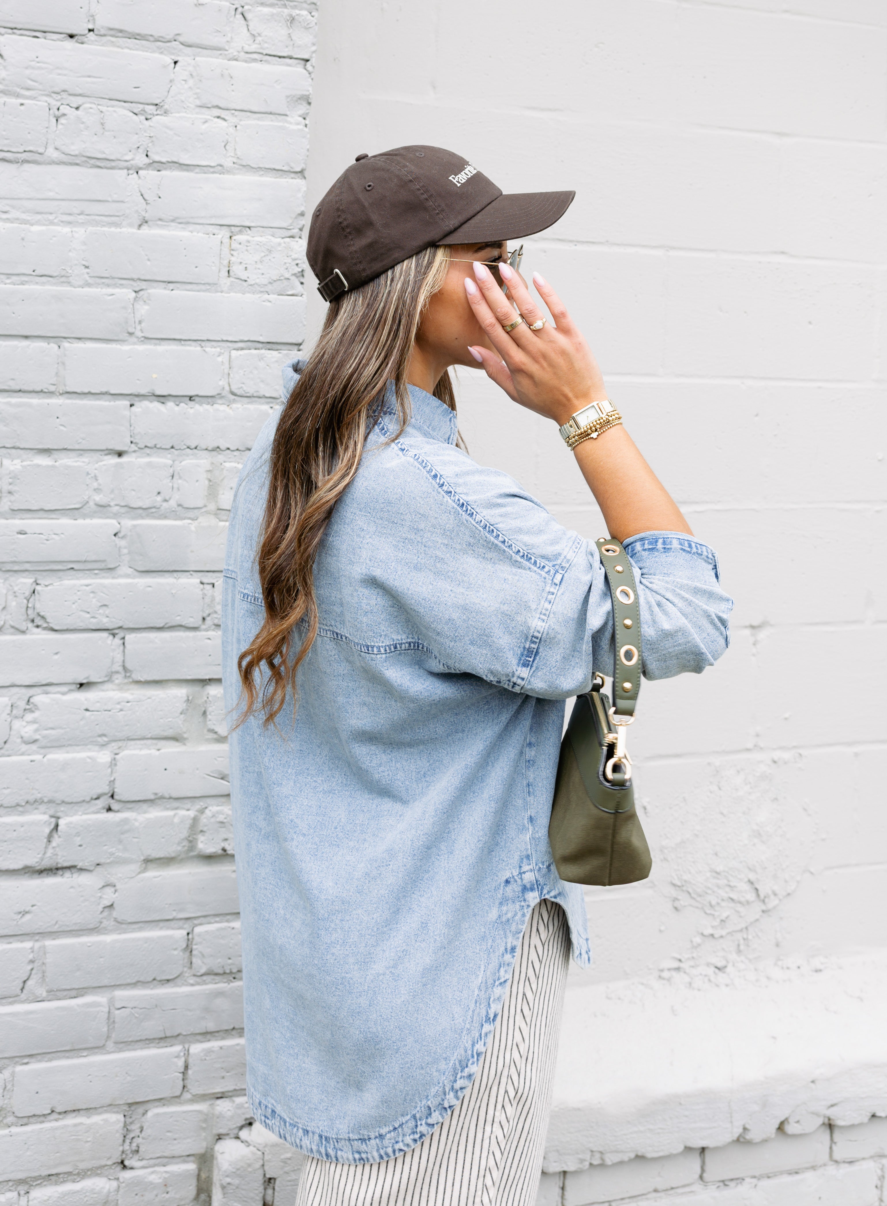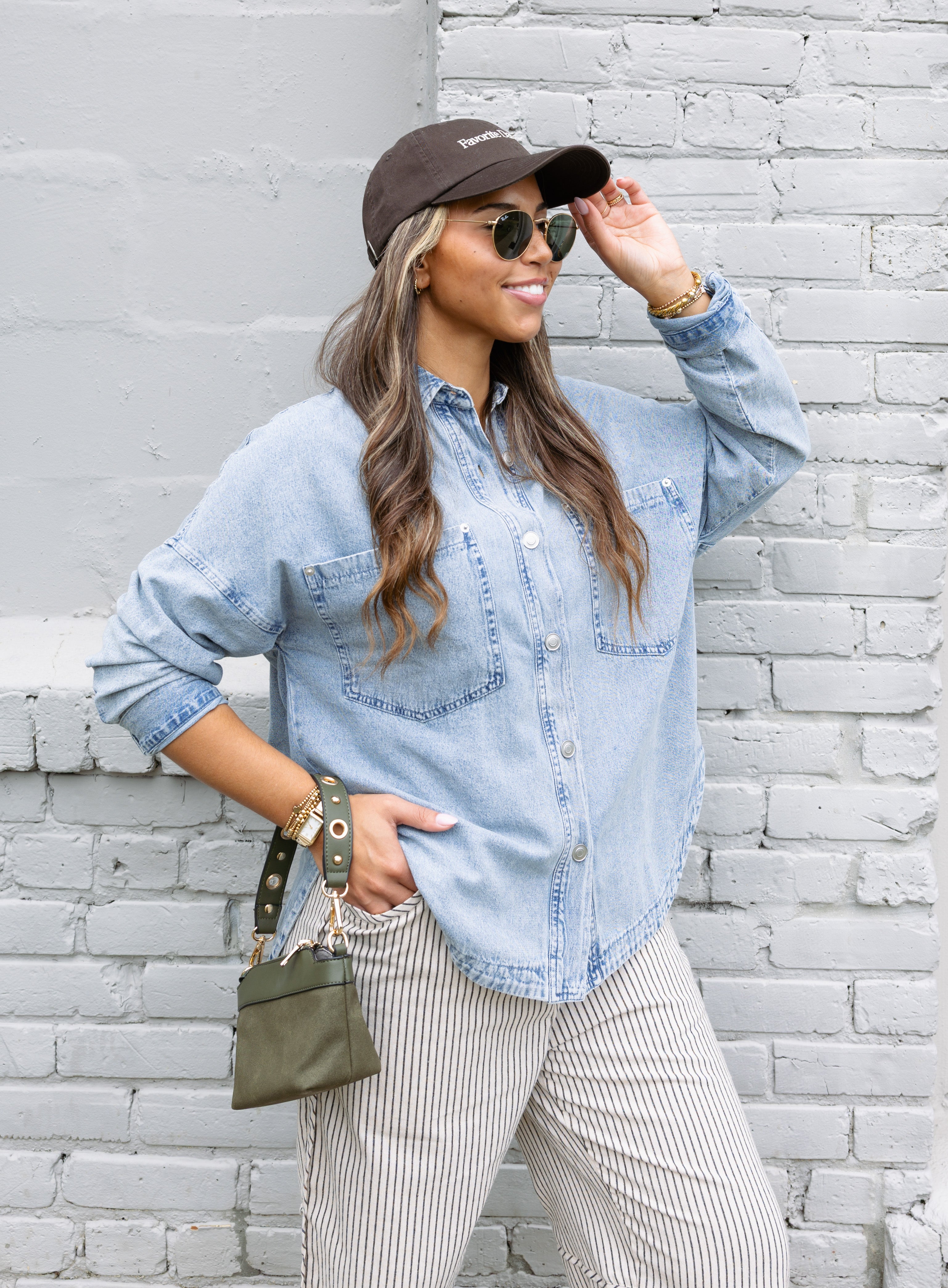 Love this top! Fits TTS. Can be dressed up or down. It’s a thick denim top not flimsy thin material.