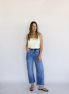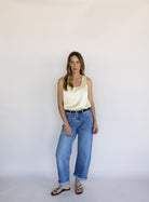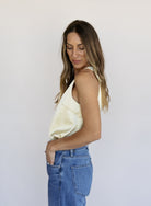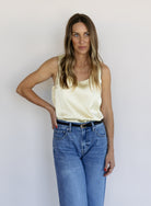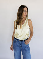 An elegant essential with a soft glow. The Golden Hour Satin Tank features a flattering scoop neckline and fluid drape that gives it an effortlessly polished feel. In a delicate butter yellow hue, it’s perfect worn on its own with denim or layered under a blazer for a refined, feminine look.