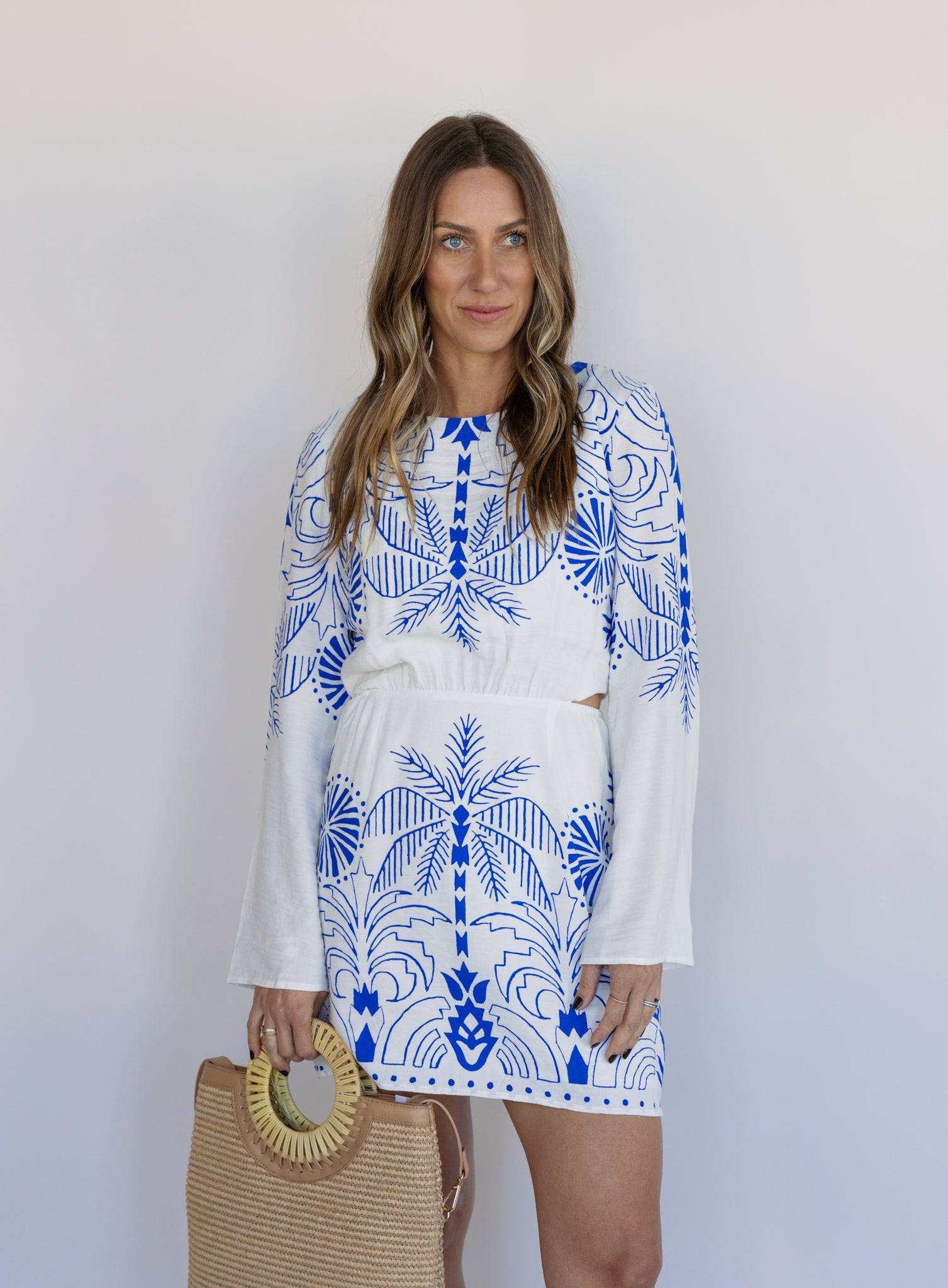 Vacation-ready and effortlessly flattering. The Tahini Palm Mini Dress features a bold blue palm print on a crisp white base with a flattering, easy silhouette that skims just right. The long sleeves balance the shorter length, while the subtle waist detail and side cutouts add shape without sacrificing comfort.