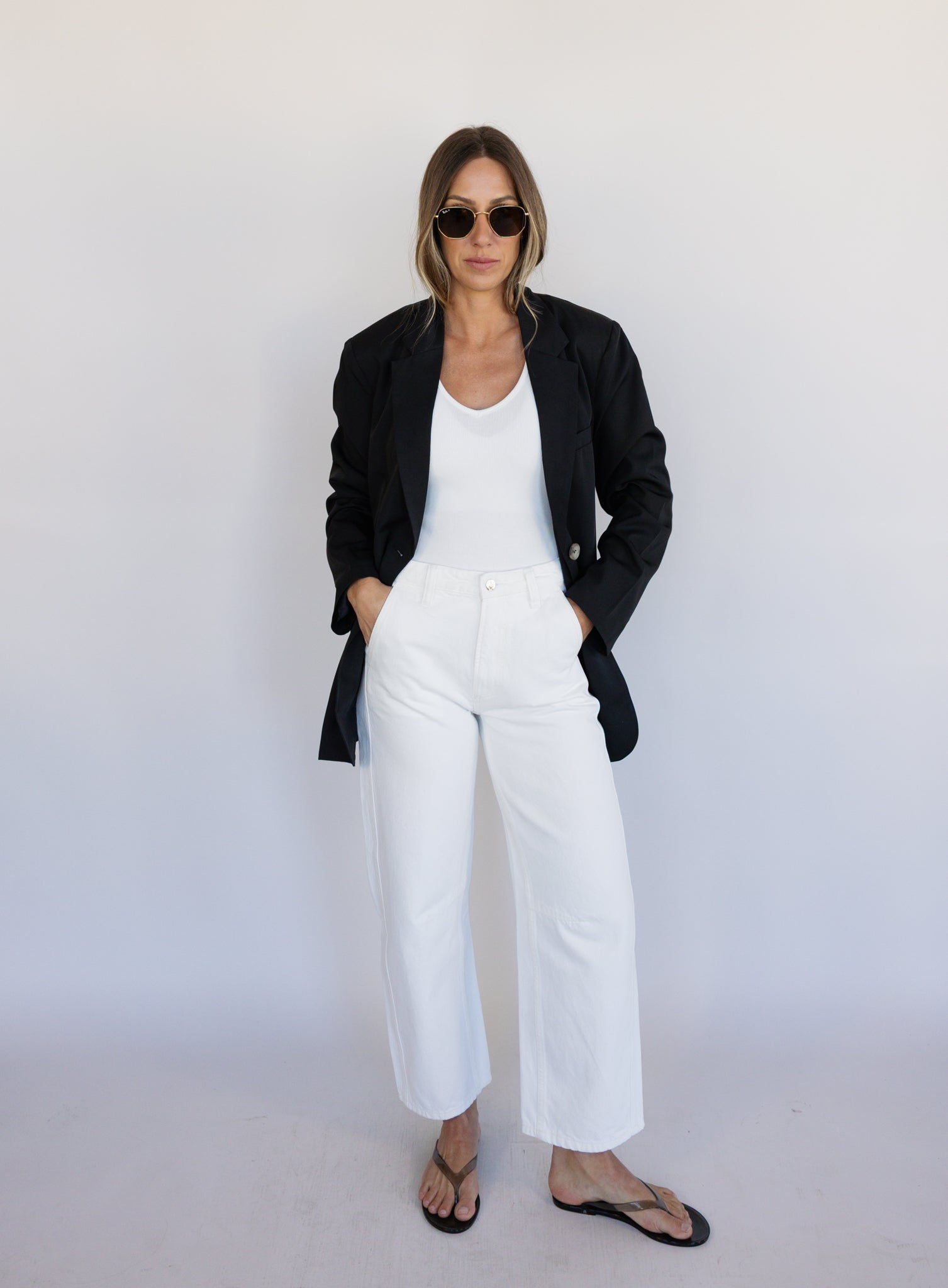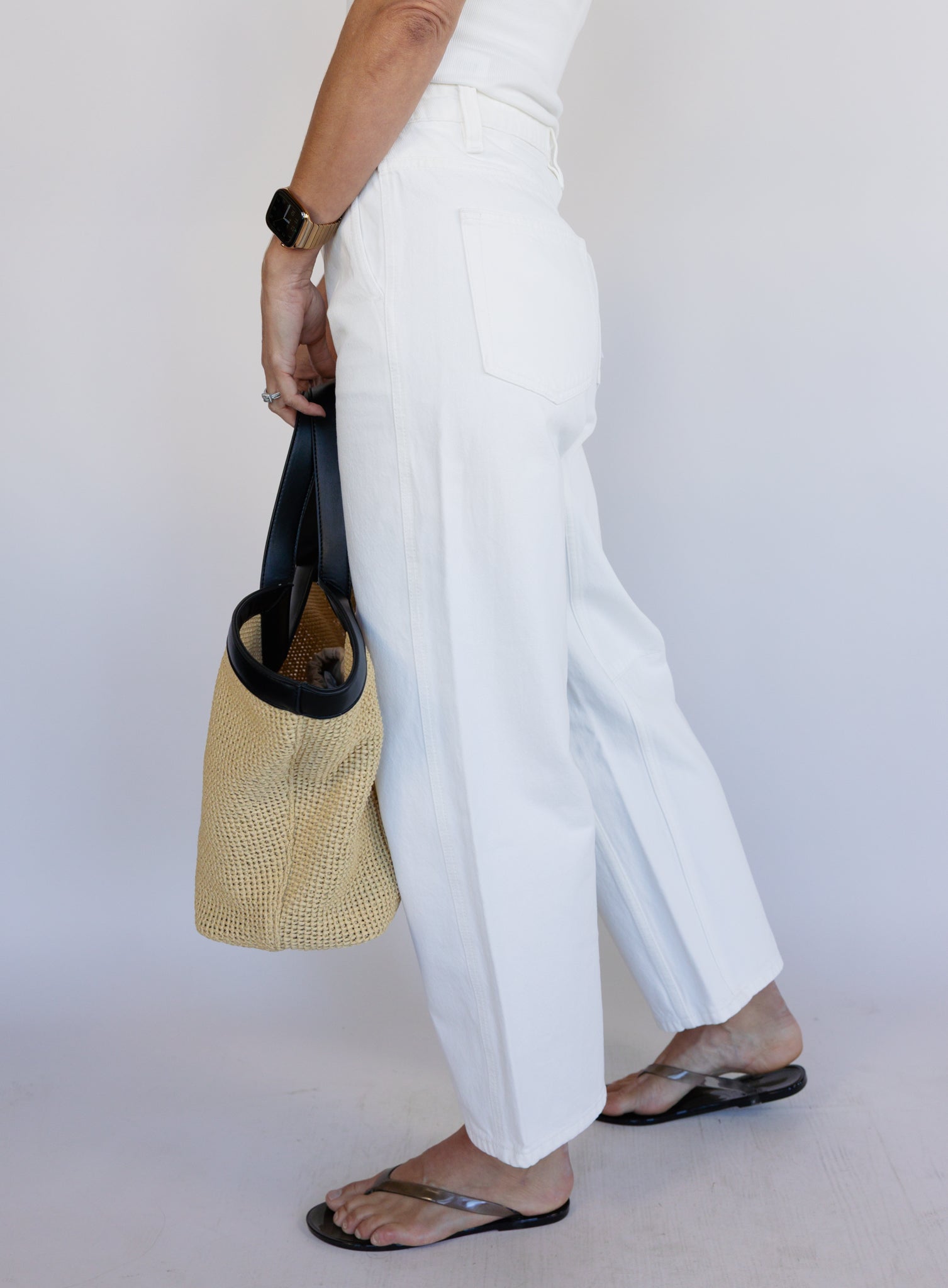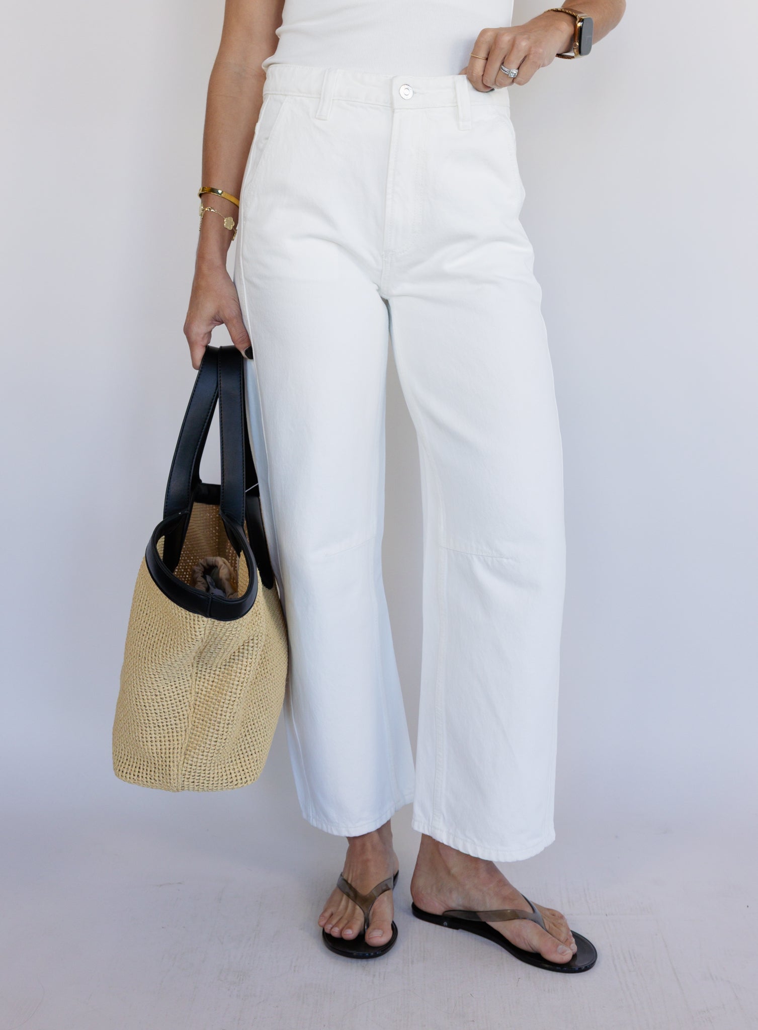 The reimagined bowed straight, Beau features sculptural seamed crescents and a cropped 27" inseam that bring a modern, architectural edge to classic denim. The raw hem keeps it easy, the wide opening adds balance. Crafted from rigid non-stretch denim in Paper White—a clean, crisp hue that feels fresh, refined, and effortlessly directional.