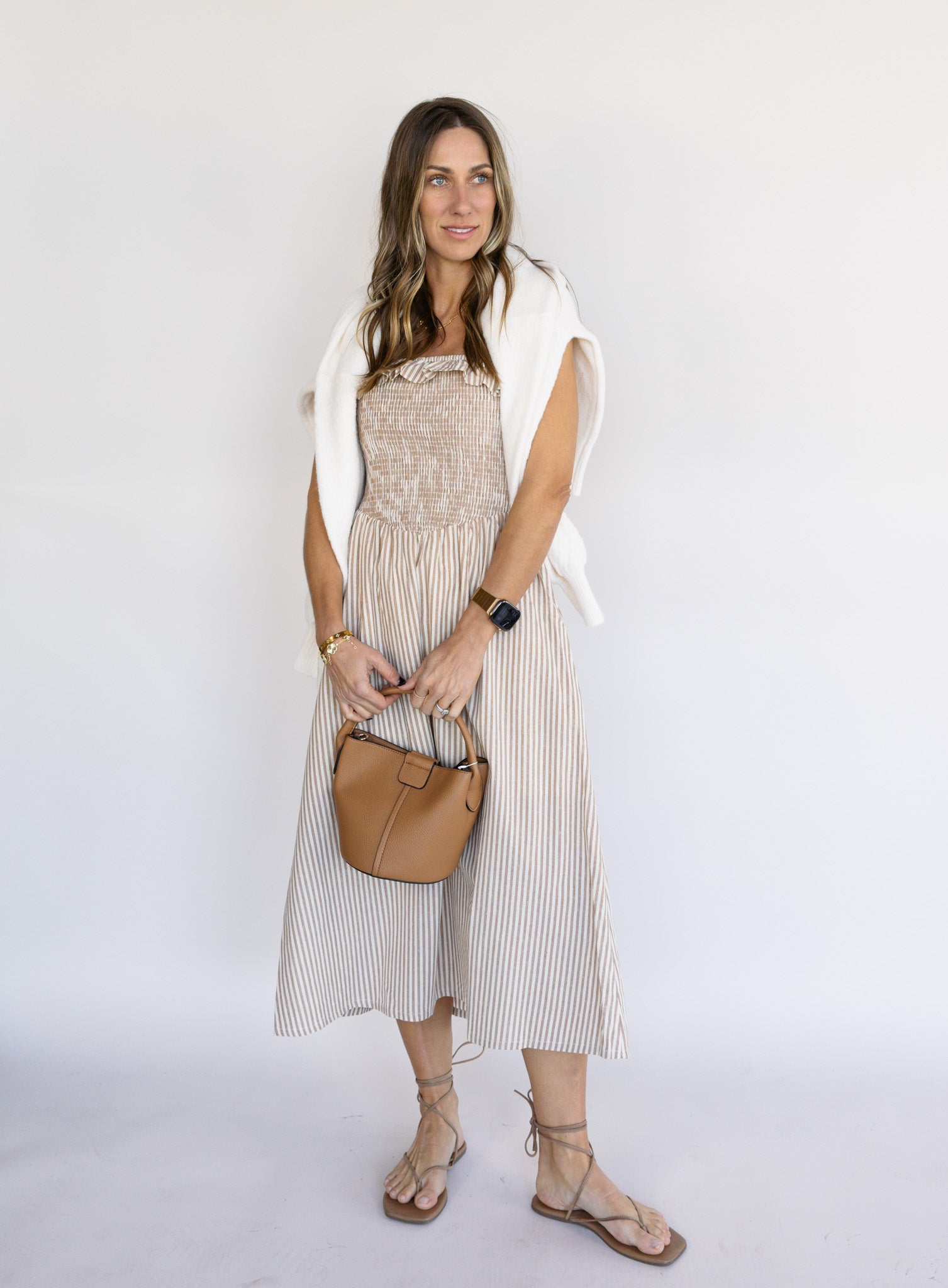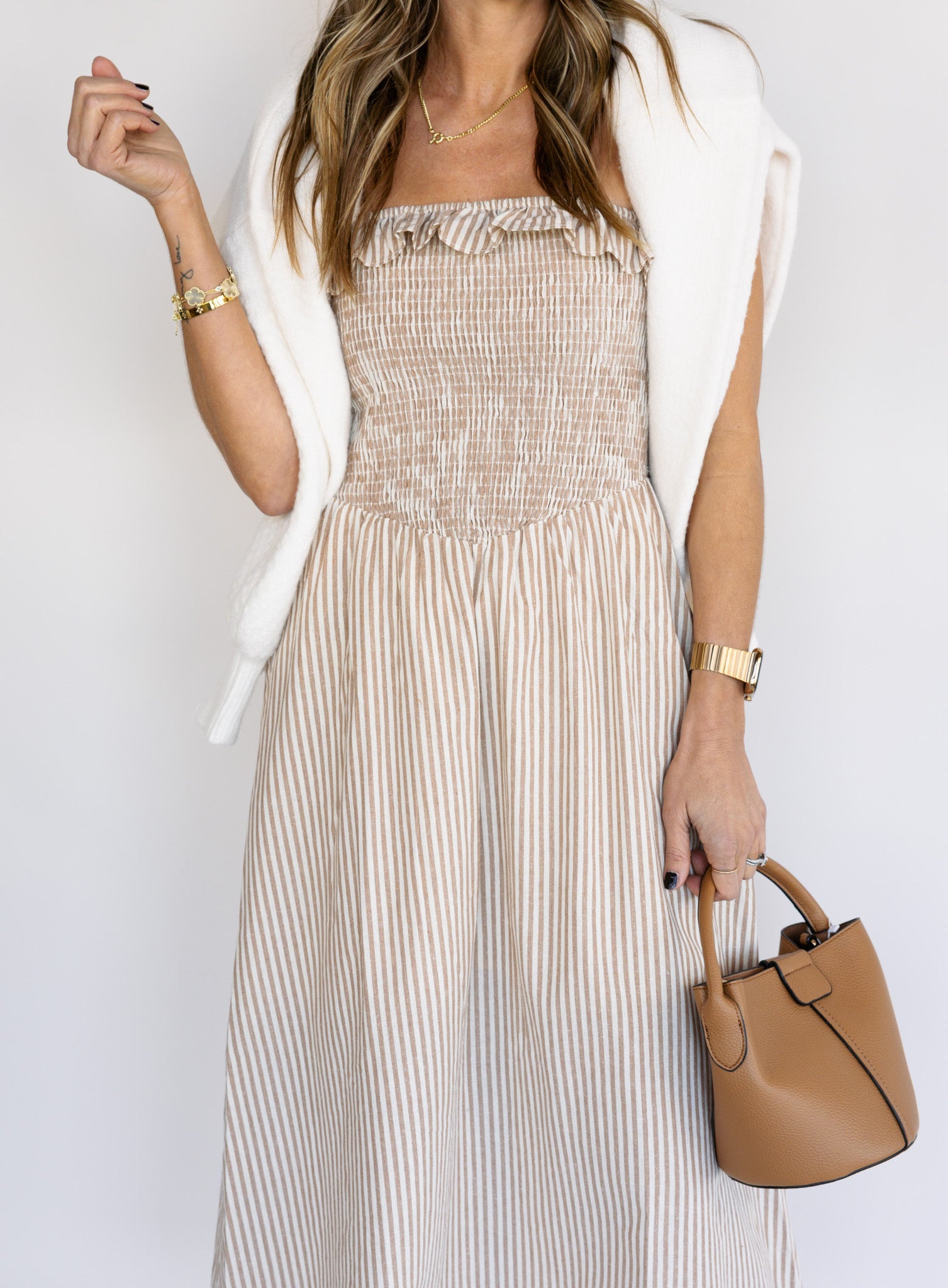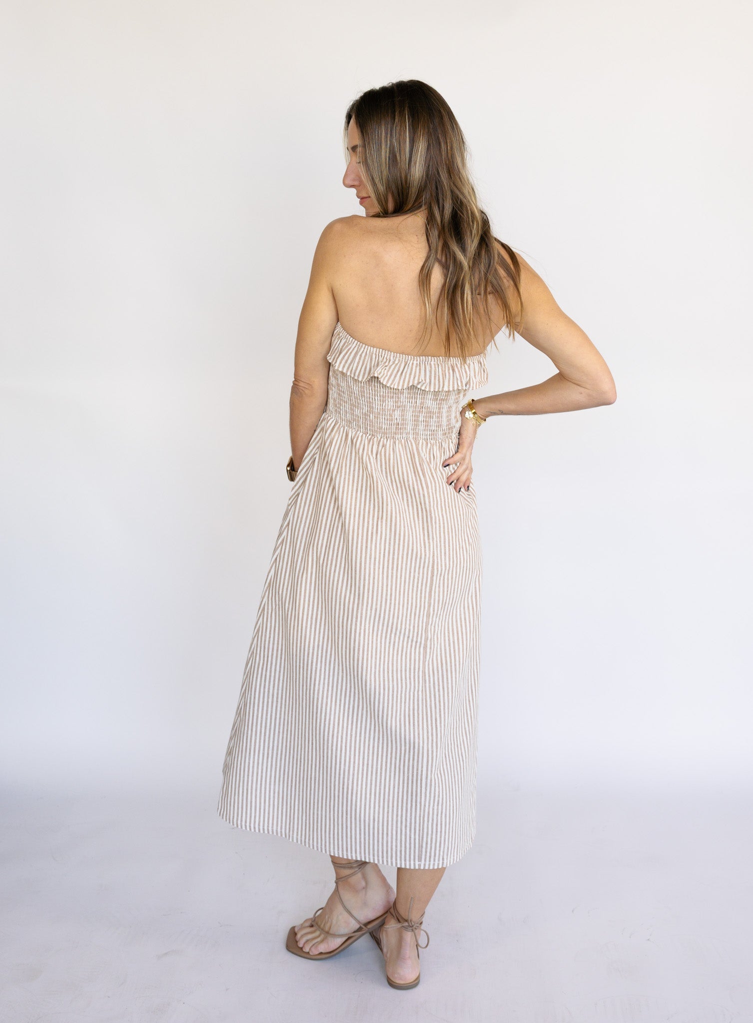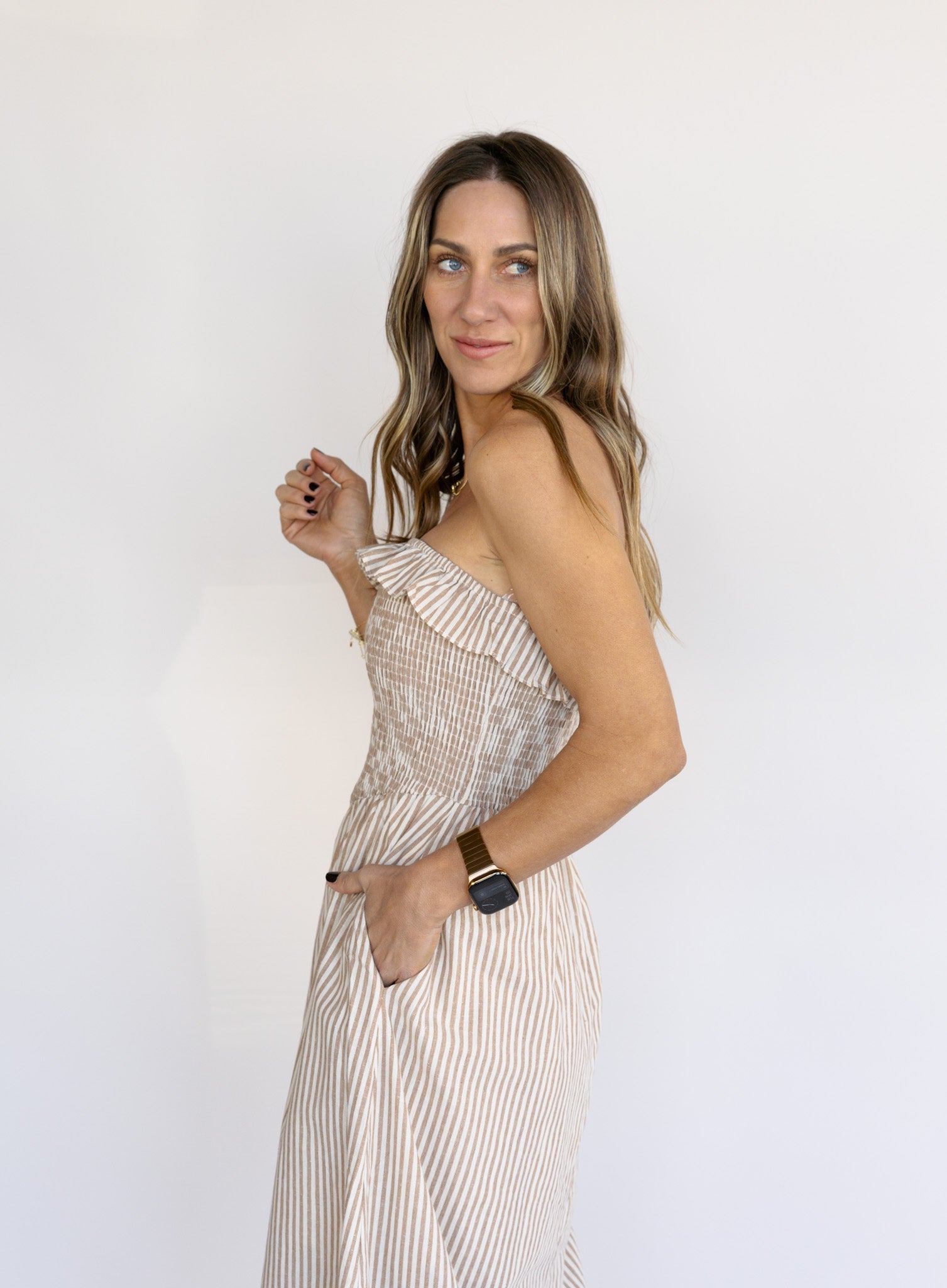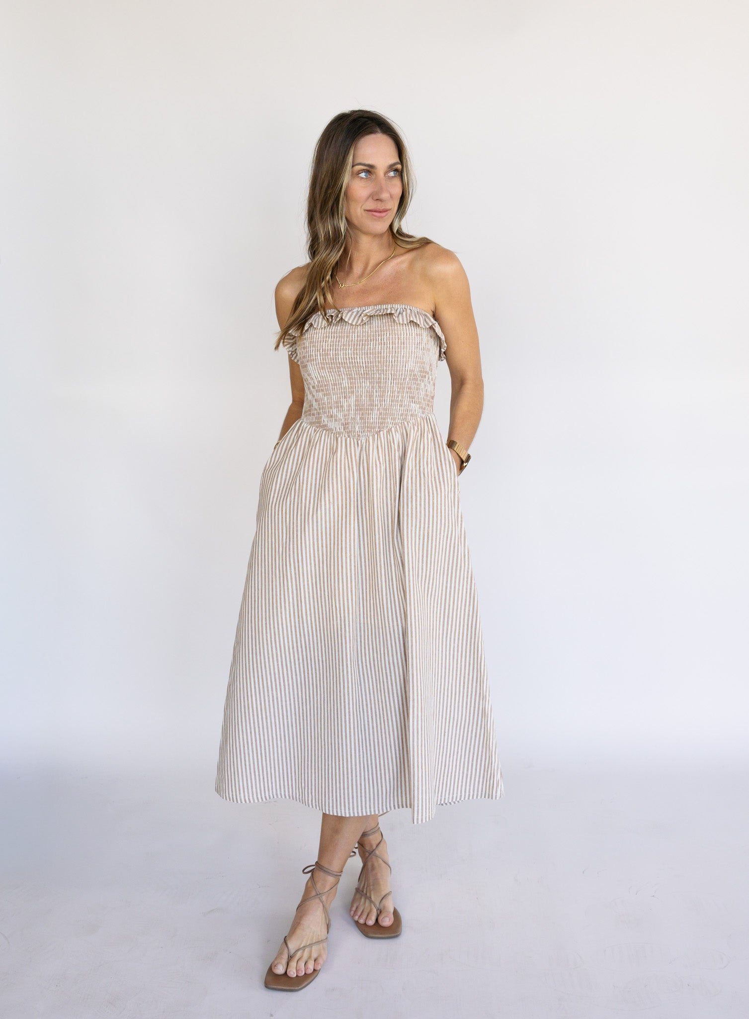 A softly structured strapless midi designed to feel easy yet intentional. With a smocked bodice, taupe and white pinstripes, and a delicate ruffle neckline, it moves beautifully and wears effortlessly—finished with pockets for that extra touch of everyday ease.