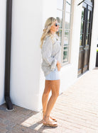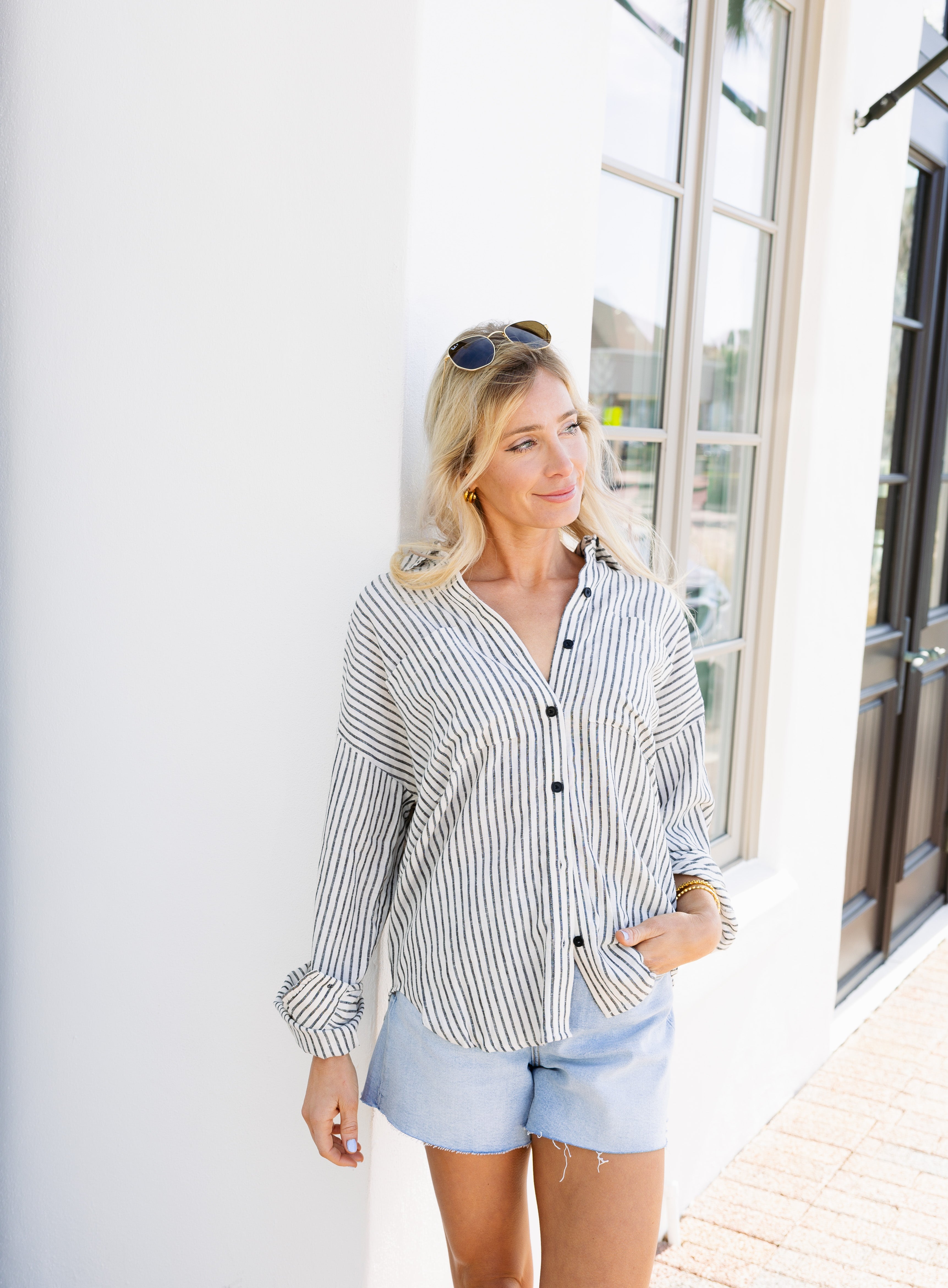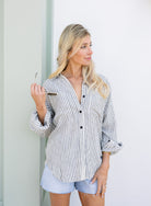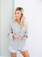 The Martey Top features an oversized, drapey fit crafted from black and white pinstripe fabric, accented with black buttons and a high collar. Its menswear-inspired design offers a refined, effortless look.
