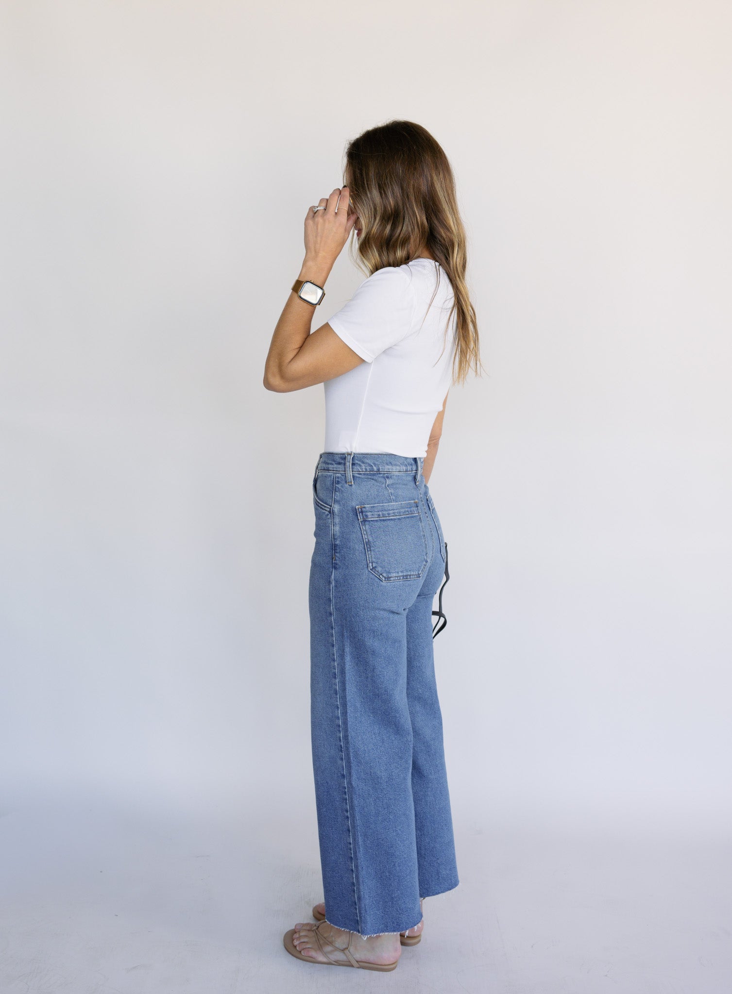 A petite super high-rise, wide-leg jean that's pinched at the waist and easy at the hips. Features a cut wide hem, front slant pockets, back patch pockets and darts for a flattering fit.