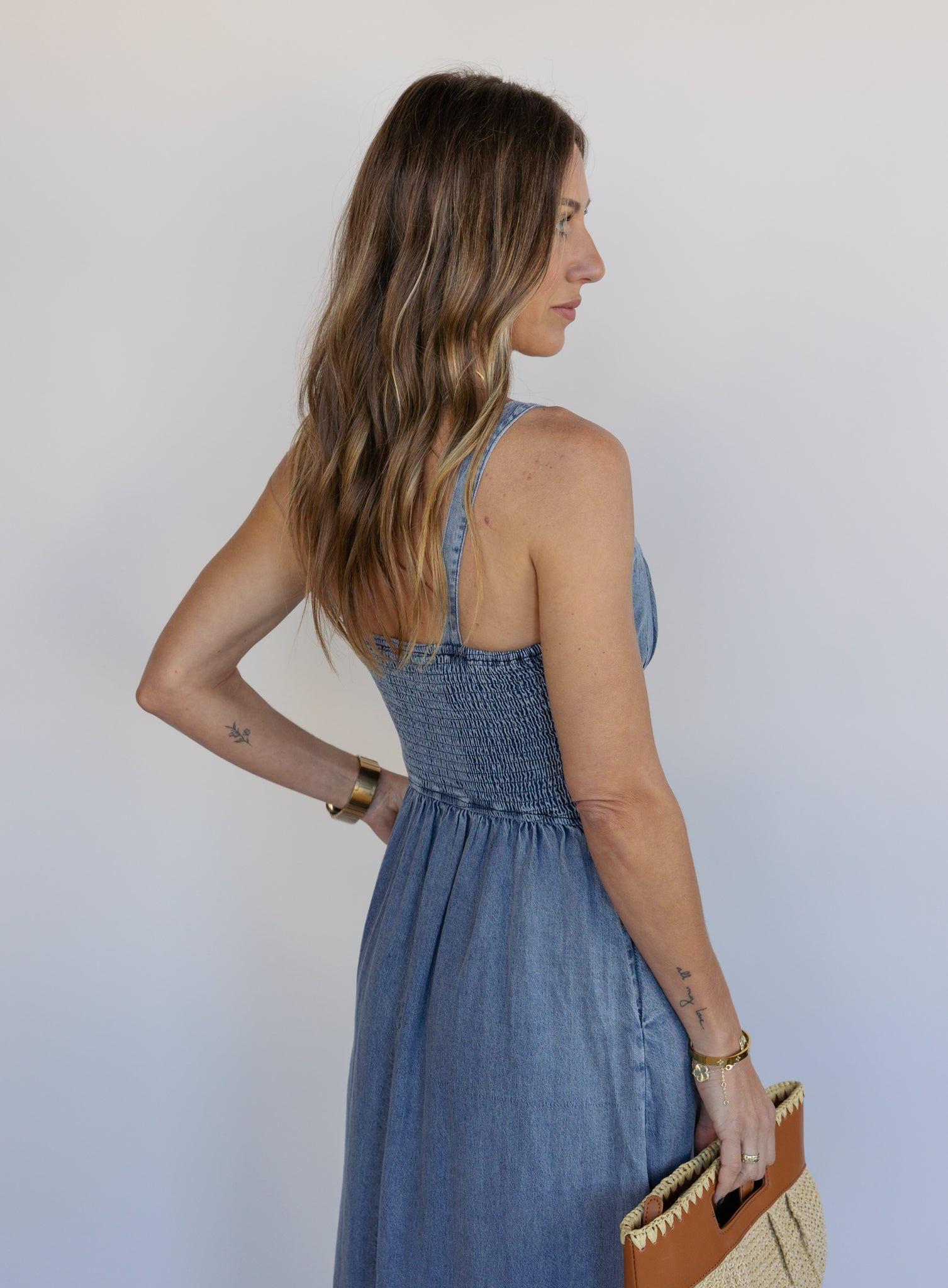 Casual, flattering, and made for easy days. The Delcia Dress features a lightweight denim fabric with a midi length and a softly structured silhouette. Designed with a basque waist, adjustable drawstring neckline, and a smocked back, it creates shape while keeping the fit comfortable.