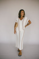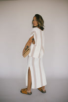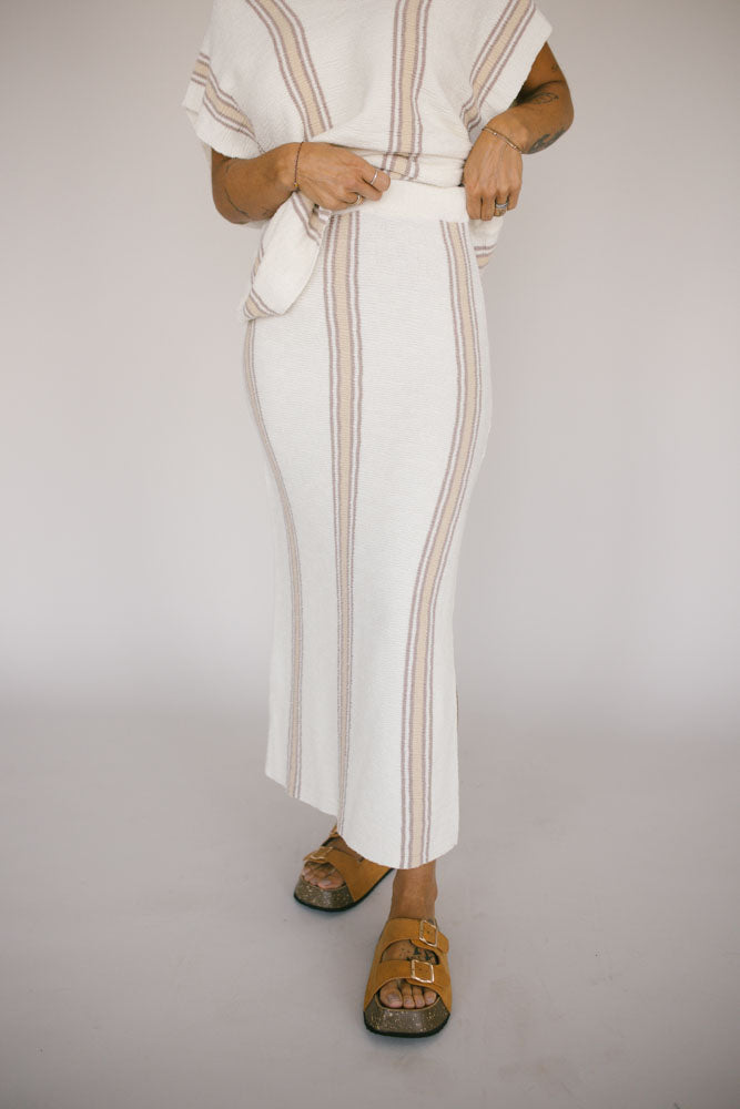 Effortlessly femme and fun, this striped midi skirt is featured in a soft cotton-blend with an elastic waistband and a side slit. Perfect for summer activities! Pair it with the matching Sweet Season Knit Top to complete the set!