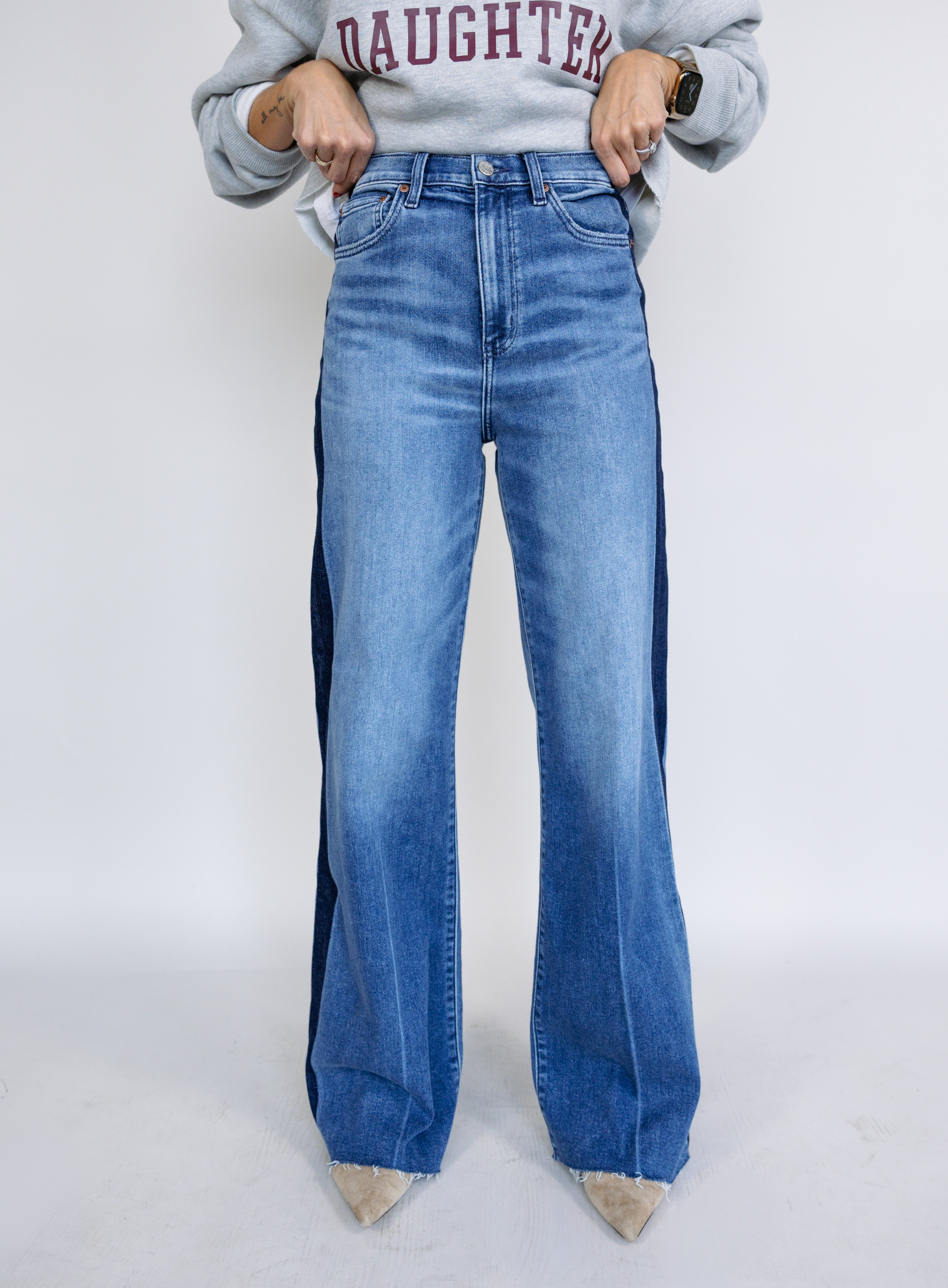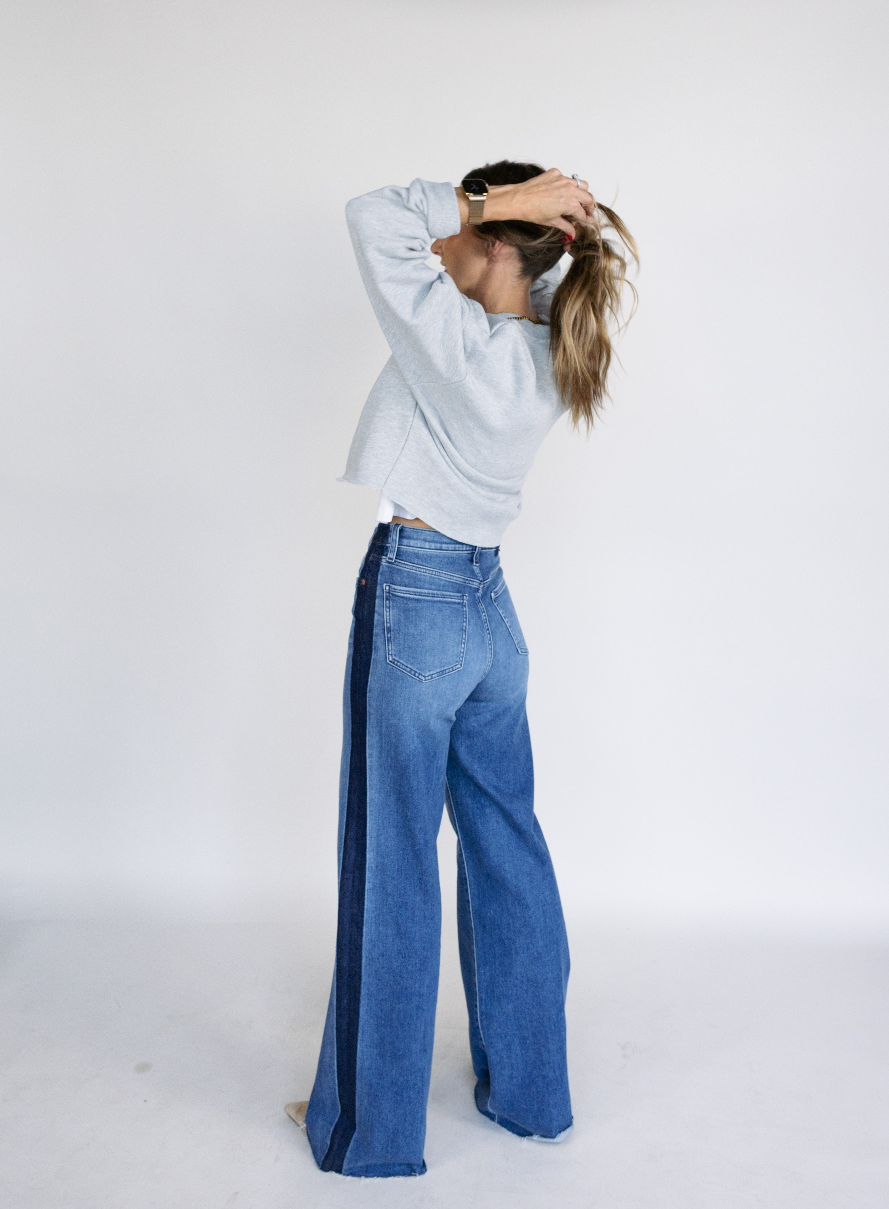 The Far Out Tuxedo Denim features a wide-leg silhouette and bold side stripe for a flattering, lengthened look. The wide leg is constructed in a denim that hugs your body, but has just enough weight to keep a structured fit. Easy to style, instantly elevated.