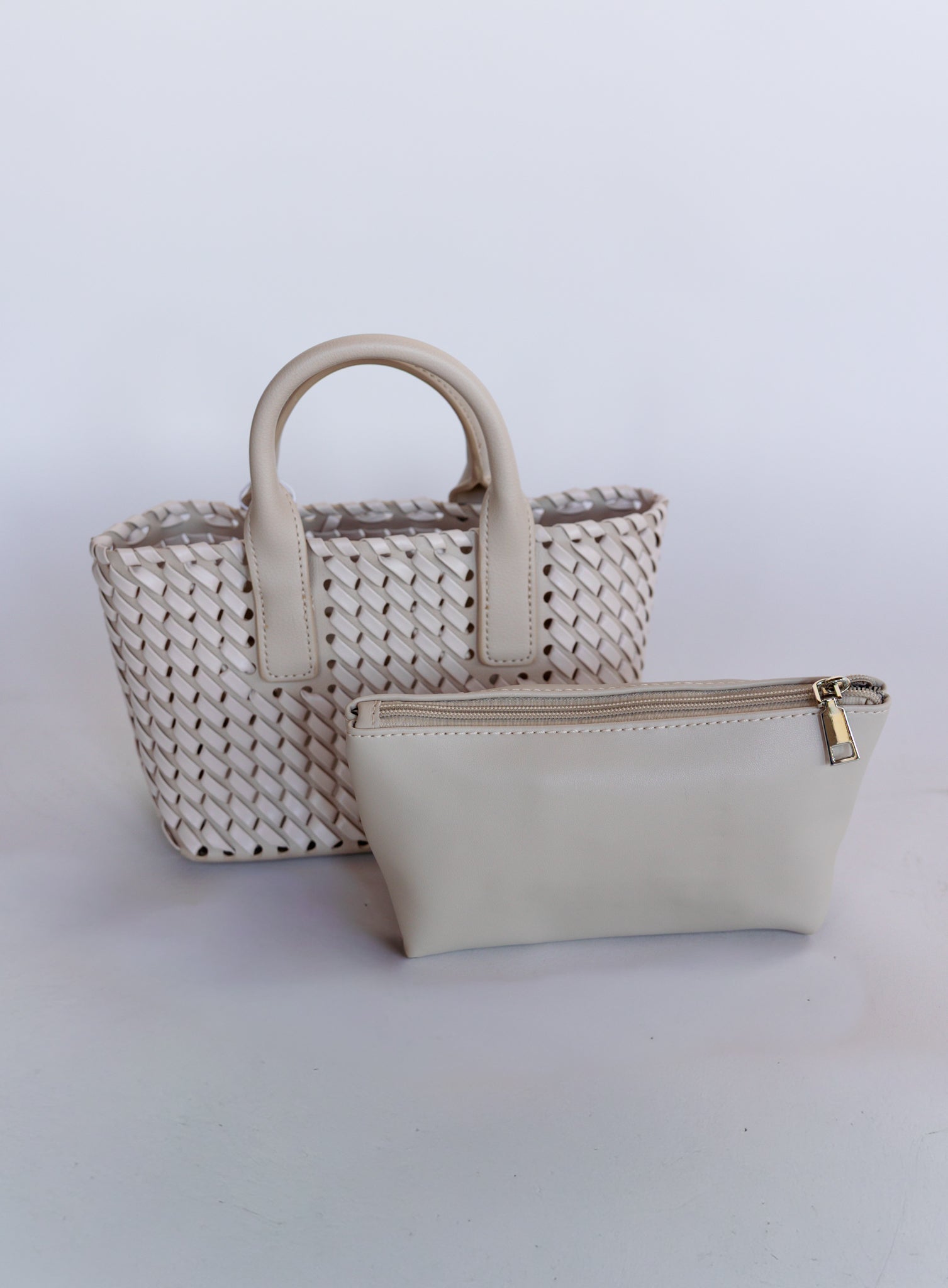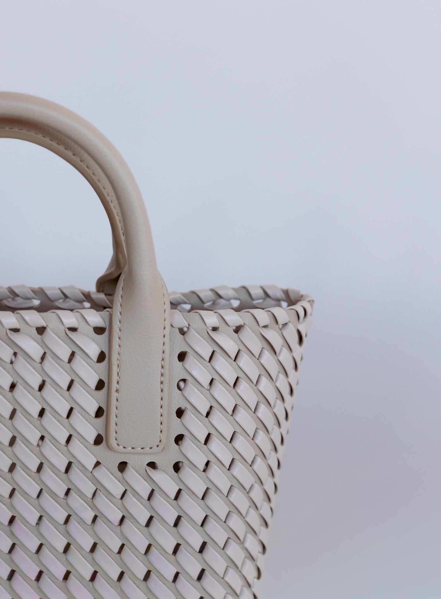 A modern take on a classic mini tote. The Paisley Woven Tote features a structured silhouette with a woven vegan leather exterior and a clean top handle for easy carry. The unlined interior is paired with a removable pouch, giving you flexibility to keep essentials organized.