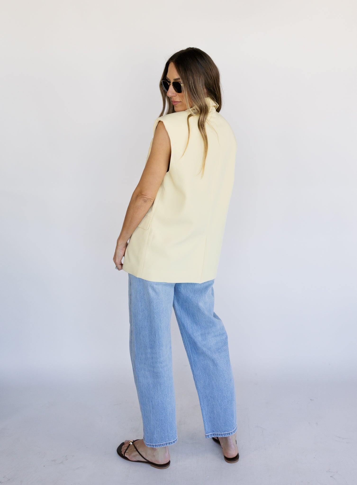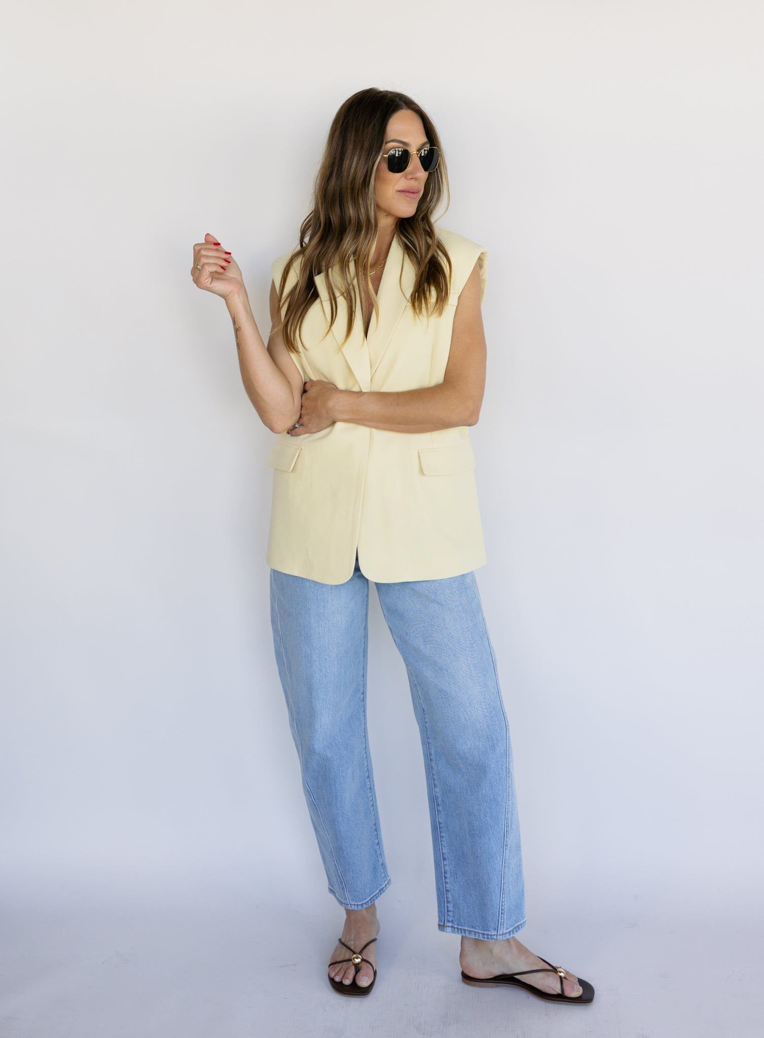 A tailored piece with a fresh, modern feel. The Ada Sleeveless Blazer Vest features subtle shoulder padding for structure, a clean single-button closure, and a lightweight feel in a soft butter yellow hue. The sleeveless silhouette keeps it easy while still feeling put-together.