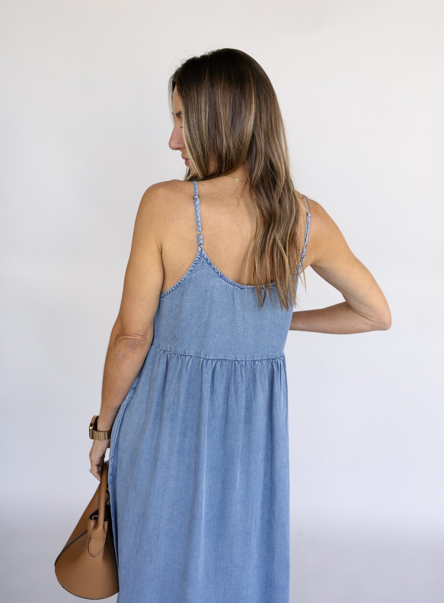 The Daylight Denim Dress offers a lightweight and breathable feel that is perfect for warmer weather. It features a flowy, flattering silhouette with adjustable straps to provide a customized, comfortable fit. With its soft, silky drape, this versatile maxi is an ideal choice for both casual daytime outings and elevated evening occasions.