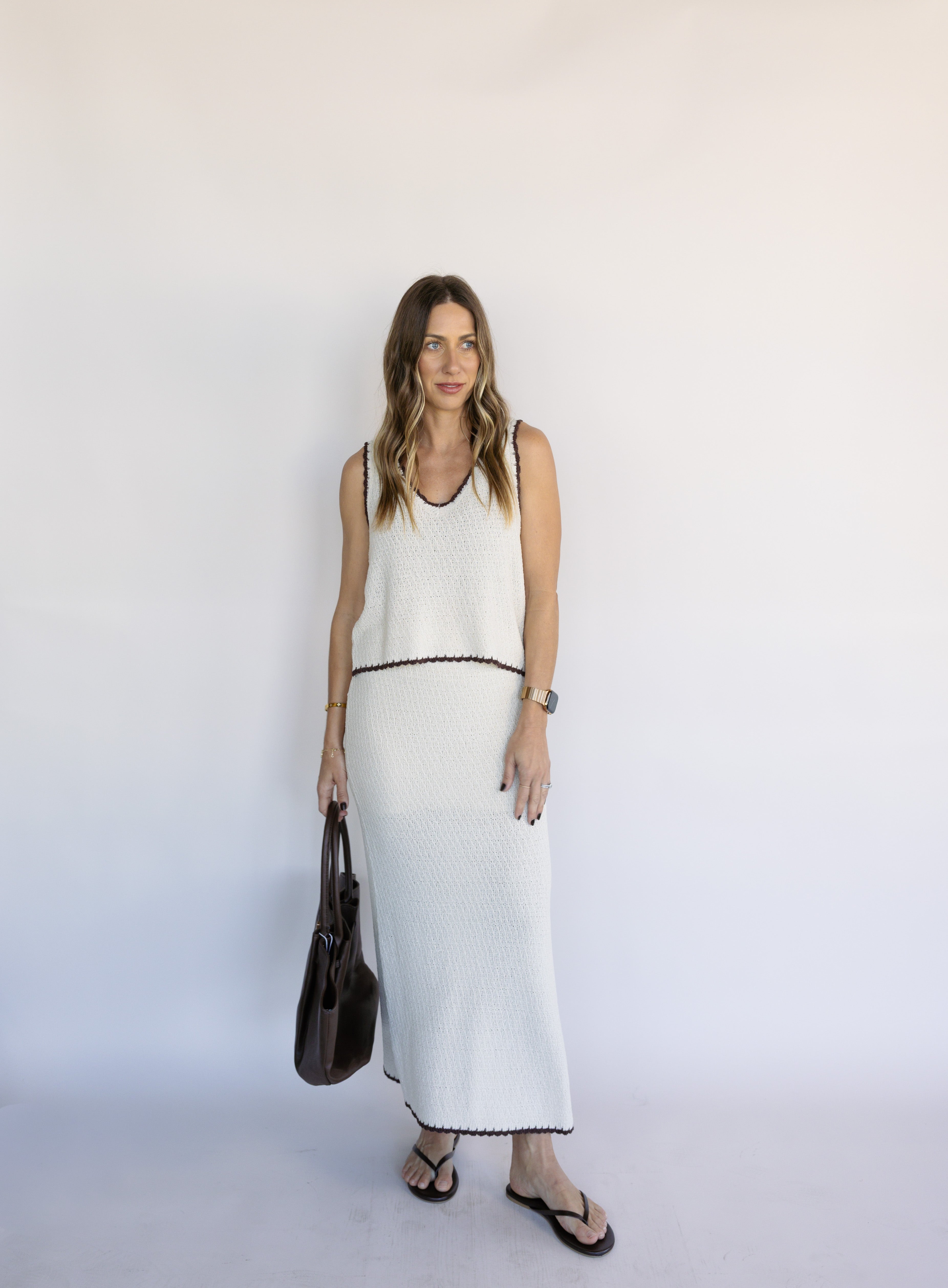 This sleeveless tank stands out with contrast color trim, yarn blend fabric, and a flattering relaxed silhouette. Make it a set with the Yessenia Whipstitch Skirt.