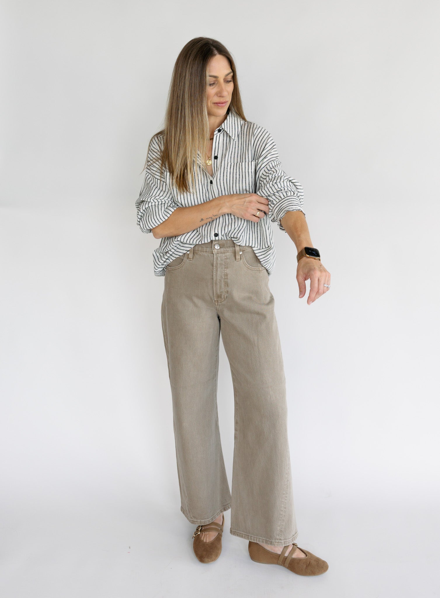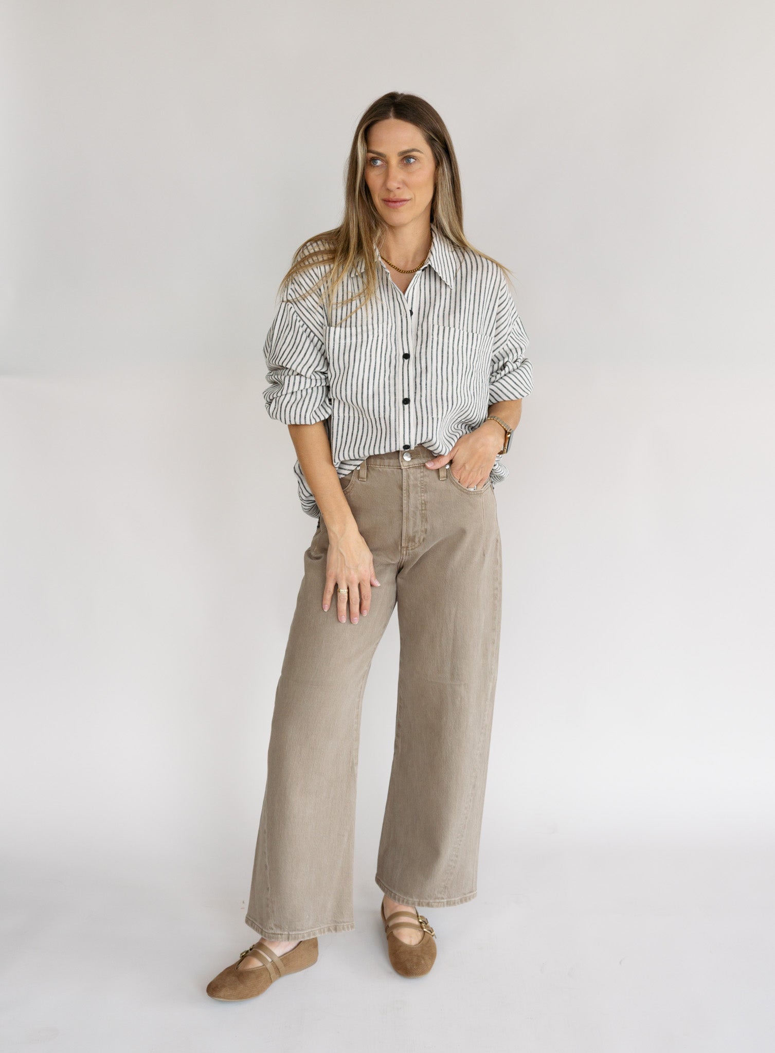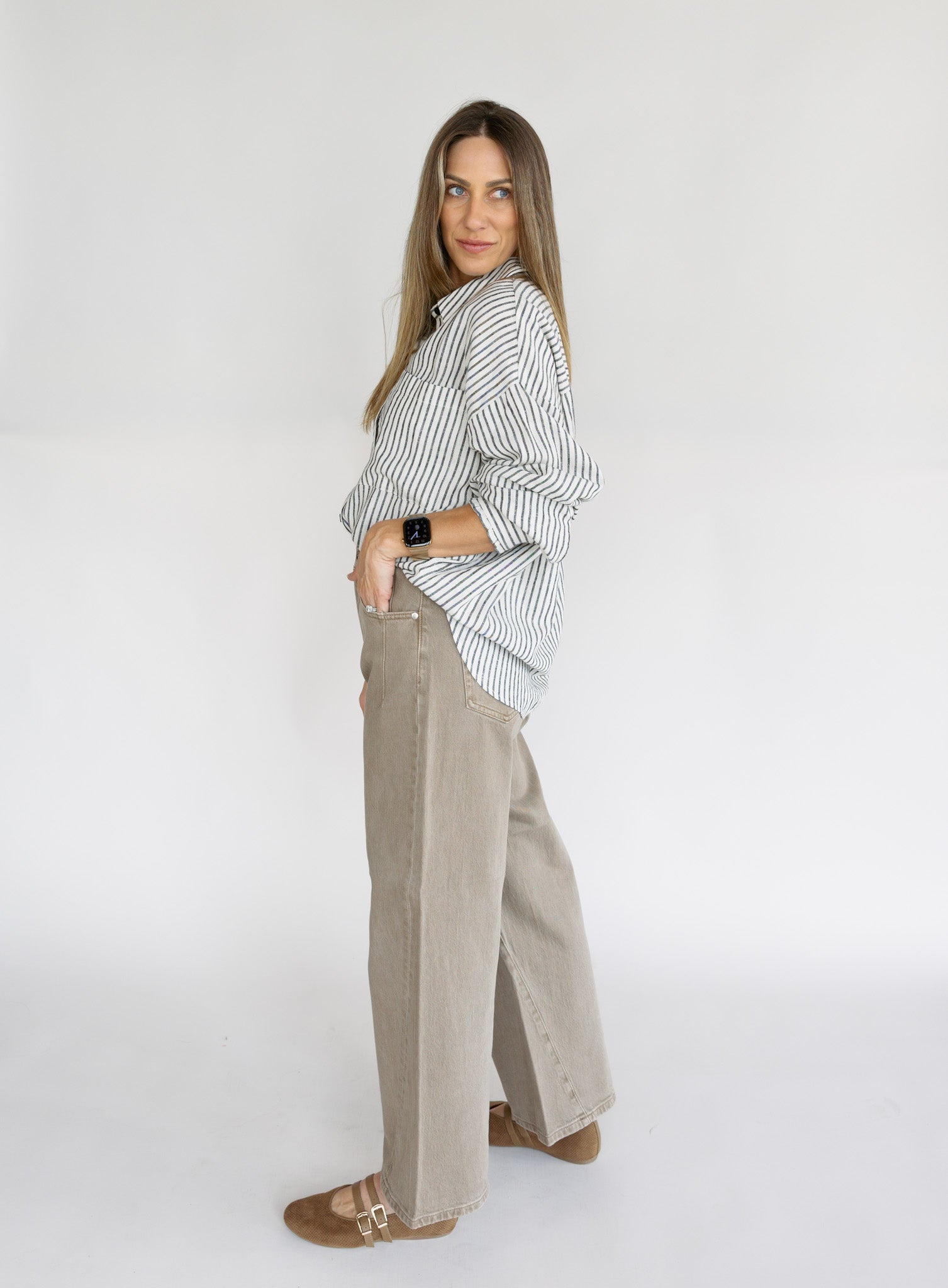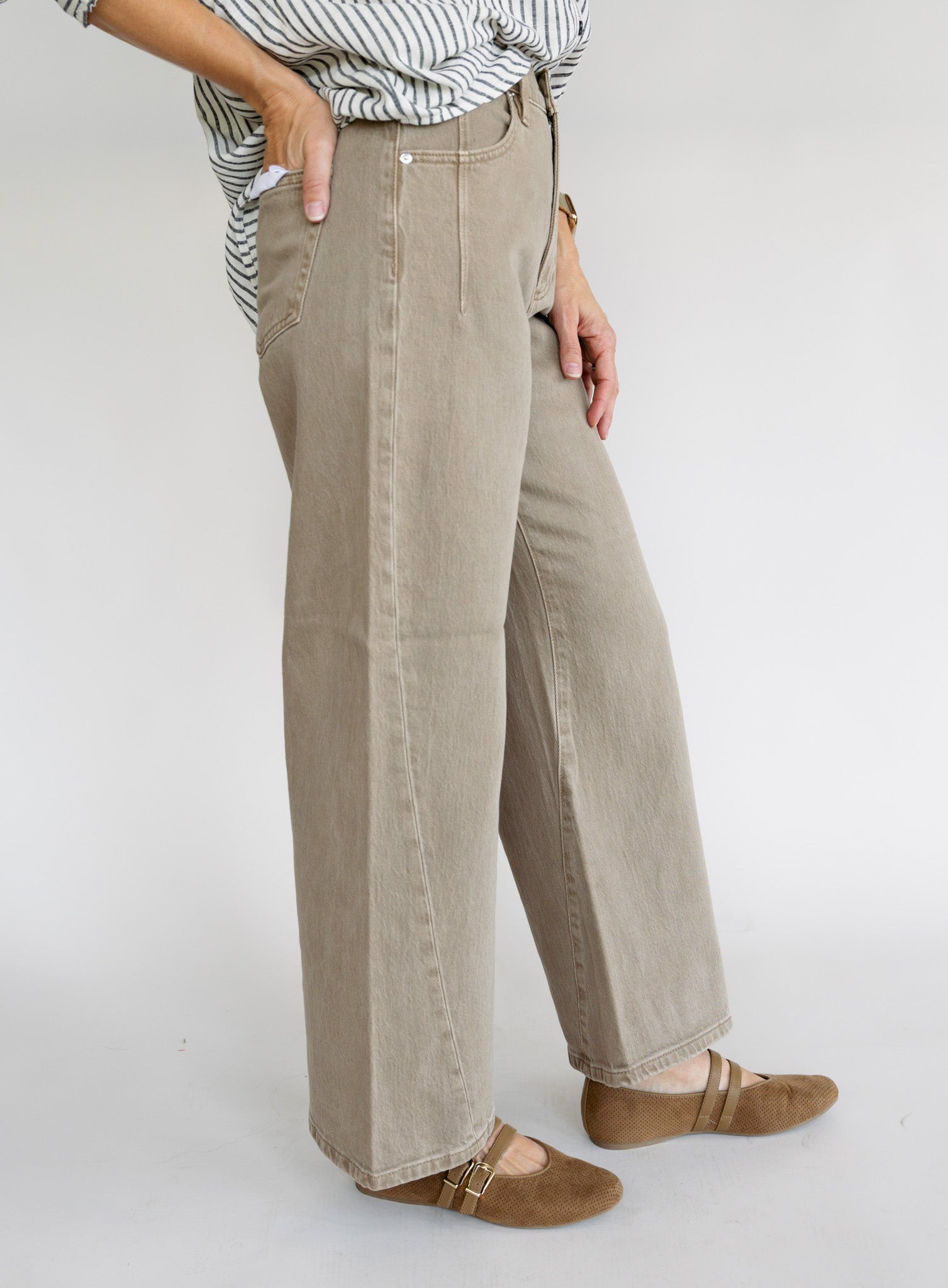 A signature silhouette with a modern twist, Kyra sits high at the waist with a subtle bowed leg and cropped 28" inseam that creates clean, sculpted proportion. Forward-twisting seams and refined yoke detailing bring contemporary structure to this wardrobe staple. Crafted from comfort stretch denim in Tannin, a warm brown wash that blends earthy sophistication with everyday versatility.