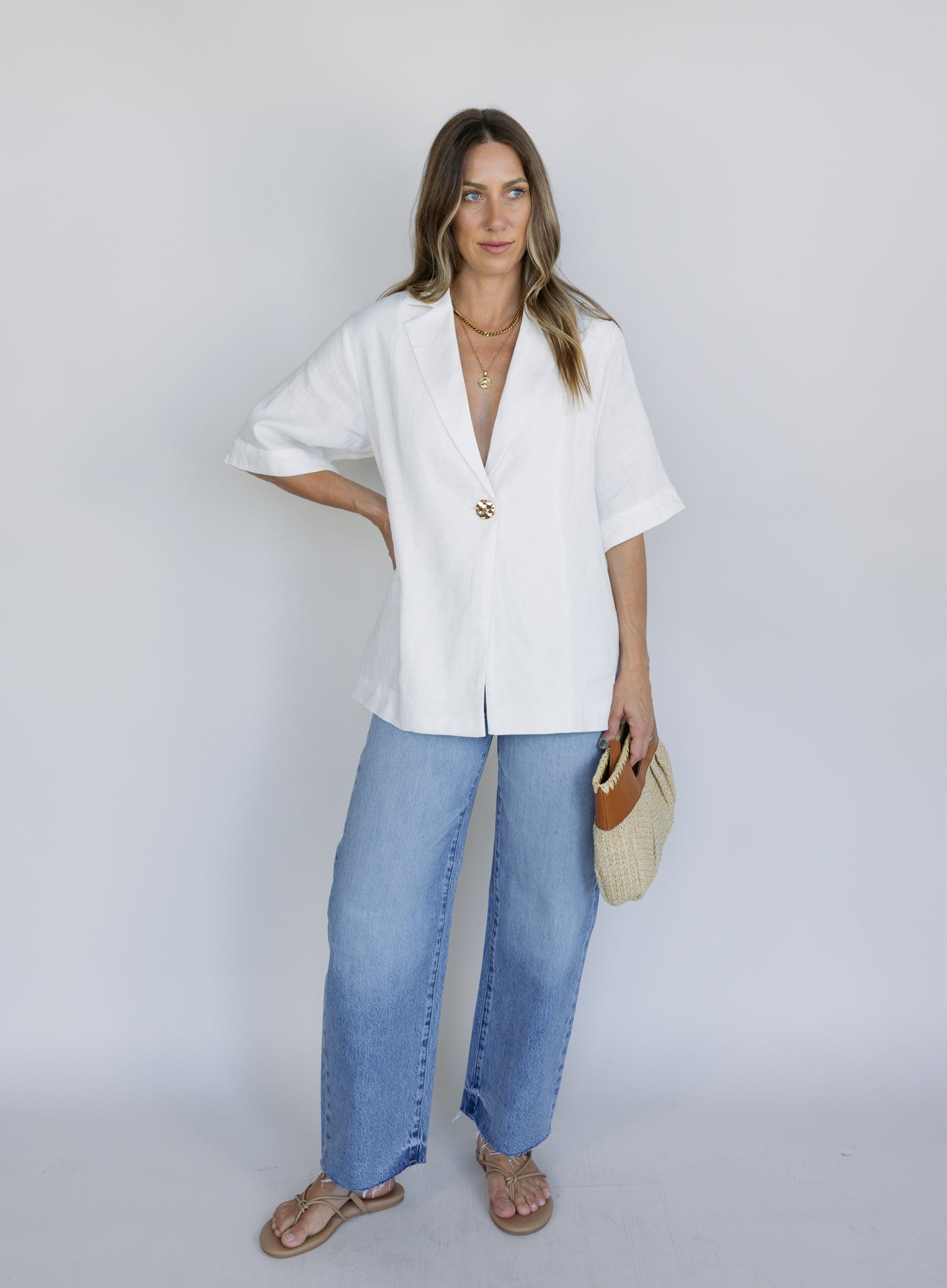 Polished and effortless with a tailored edge. The Winslet Relaxed Fit Shirt features an oversized silhouette with a structured lapel collar, single gold button closure, and wide short sleeves for a modern, airy feel. The lightweight linen and cotton lining keep it breathable while still feeling elevated.