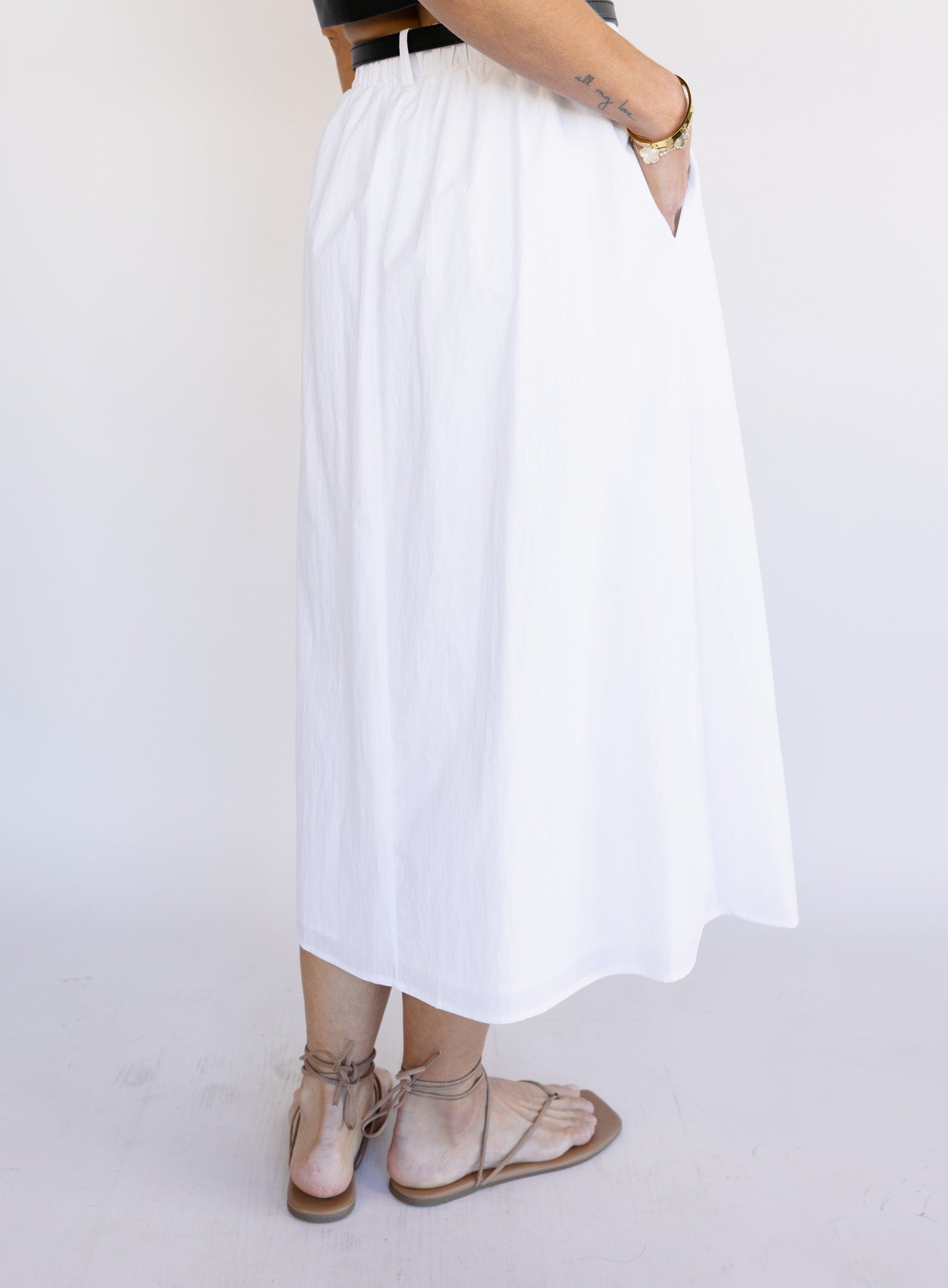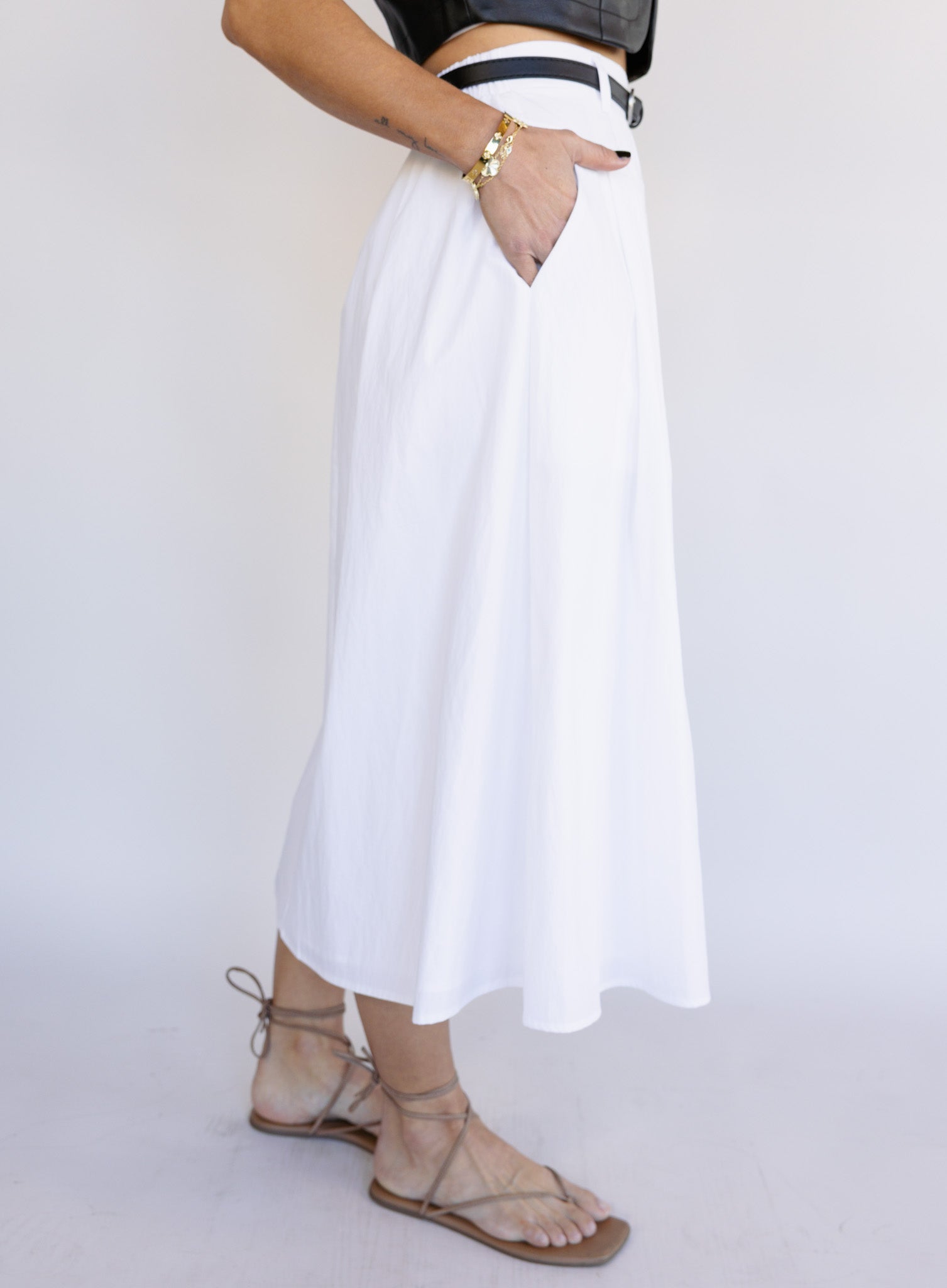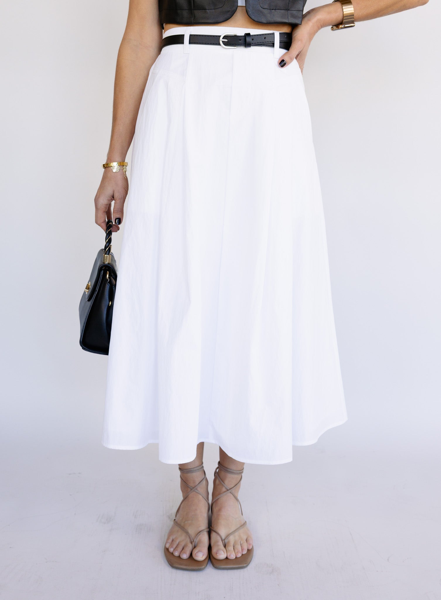 The Central Park Midi Skirt offers a clean, effortless look with a flattering midi length and soft movement. Designed with front pleats and side pockets, it includes a removable belt for added definition. Easy to dress up or down, this skirt pairs seamlessly with fitted tops, breezy blouses, or lightweight knits for a refined, versatile outfit.