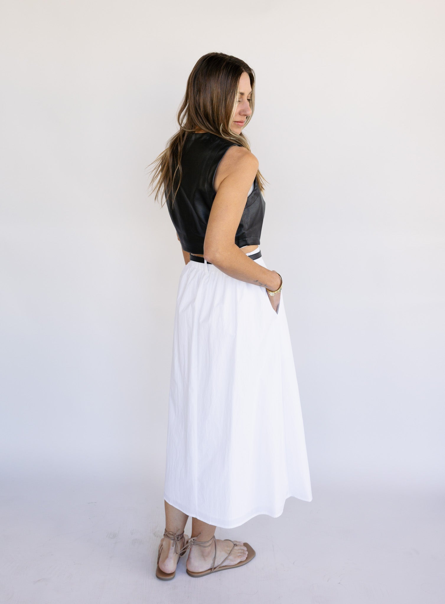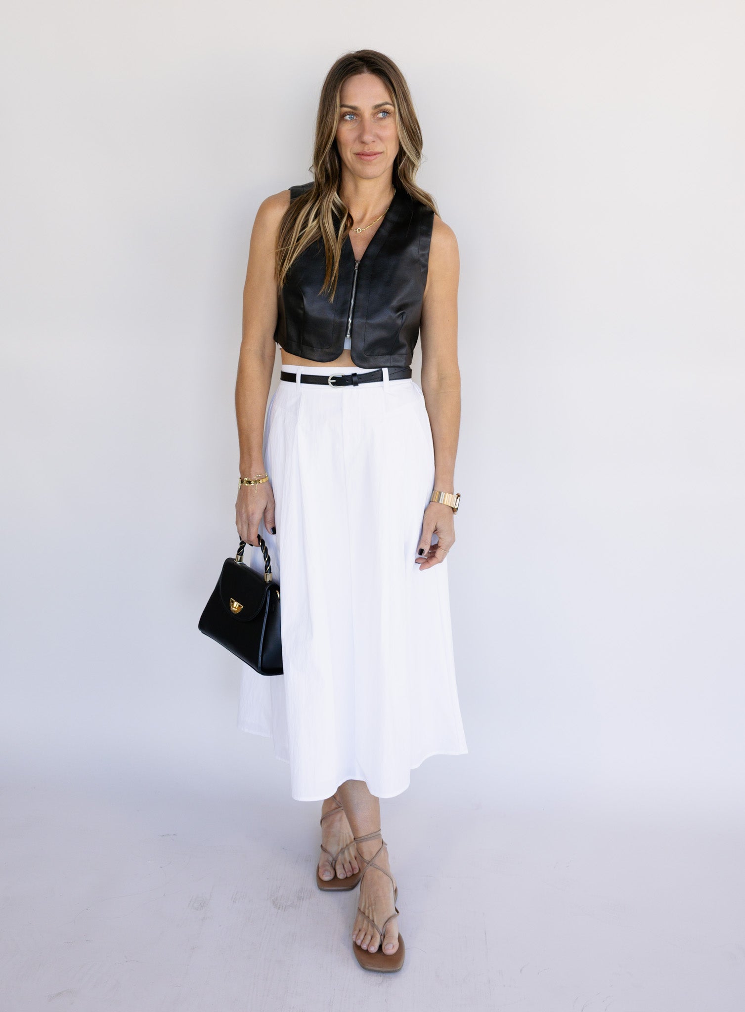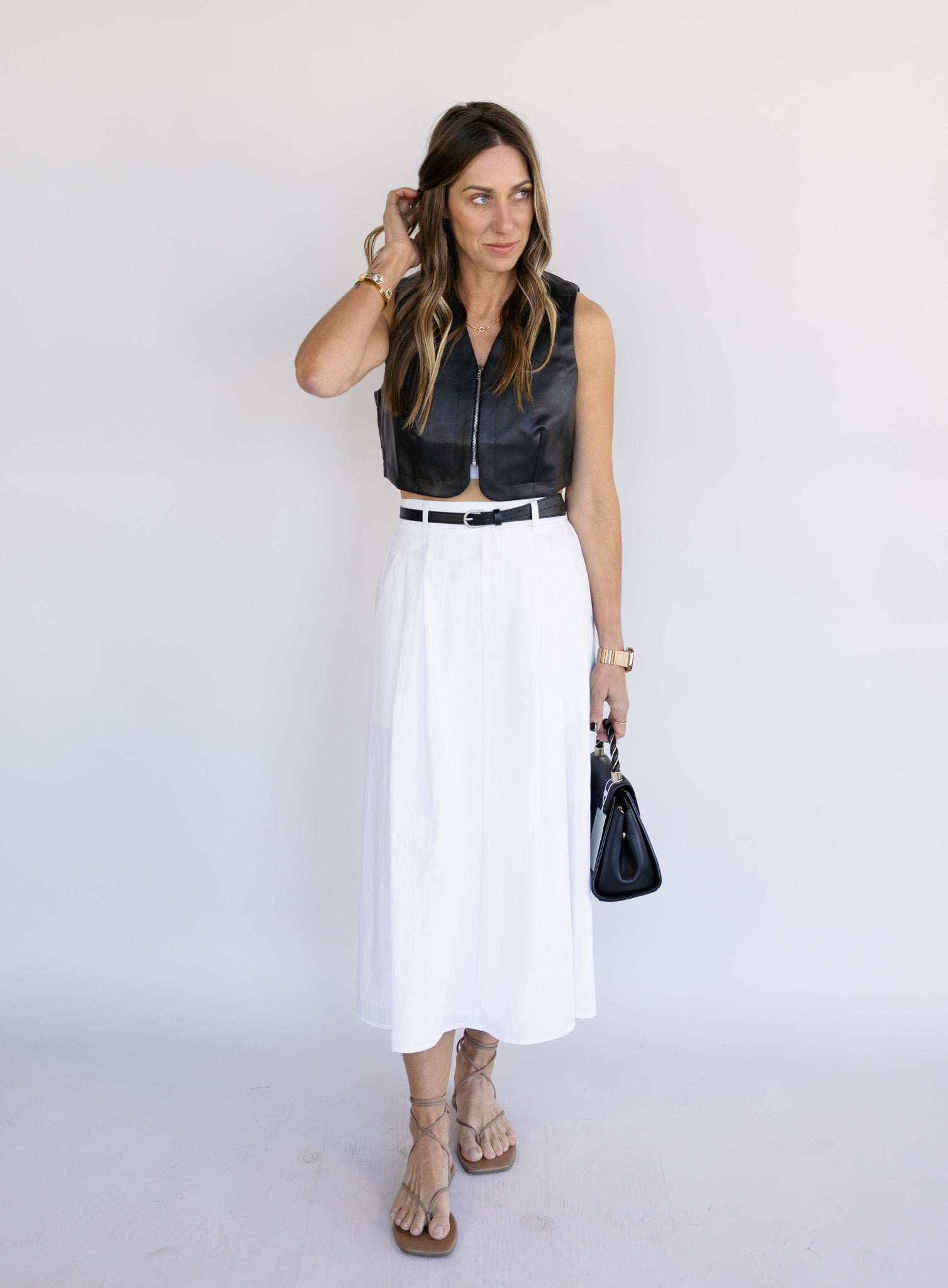 The Central Park Midi Skirt offers a clean, effortless look with a flattering midi length and soft movement. Designed with front pleats and side pockets, it includes a removable belt for added definition. Easy to dress up or down, this skirt pairs seamlessly with fitted tops, breezy blouses, or lightweight knits for a refined, versatile outfit.