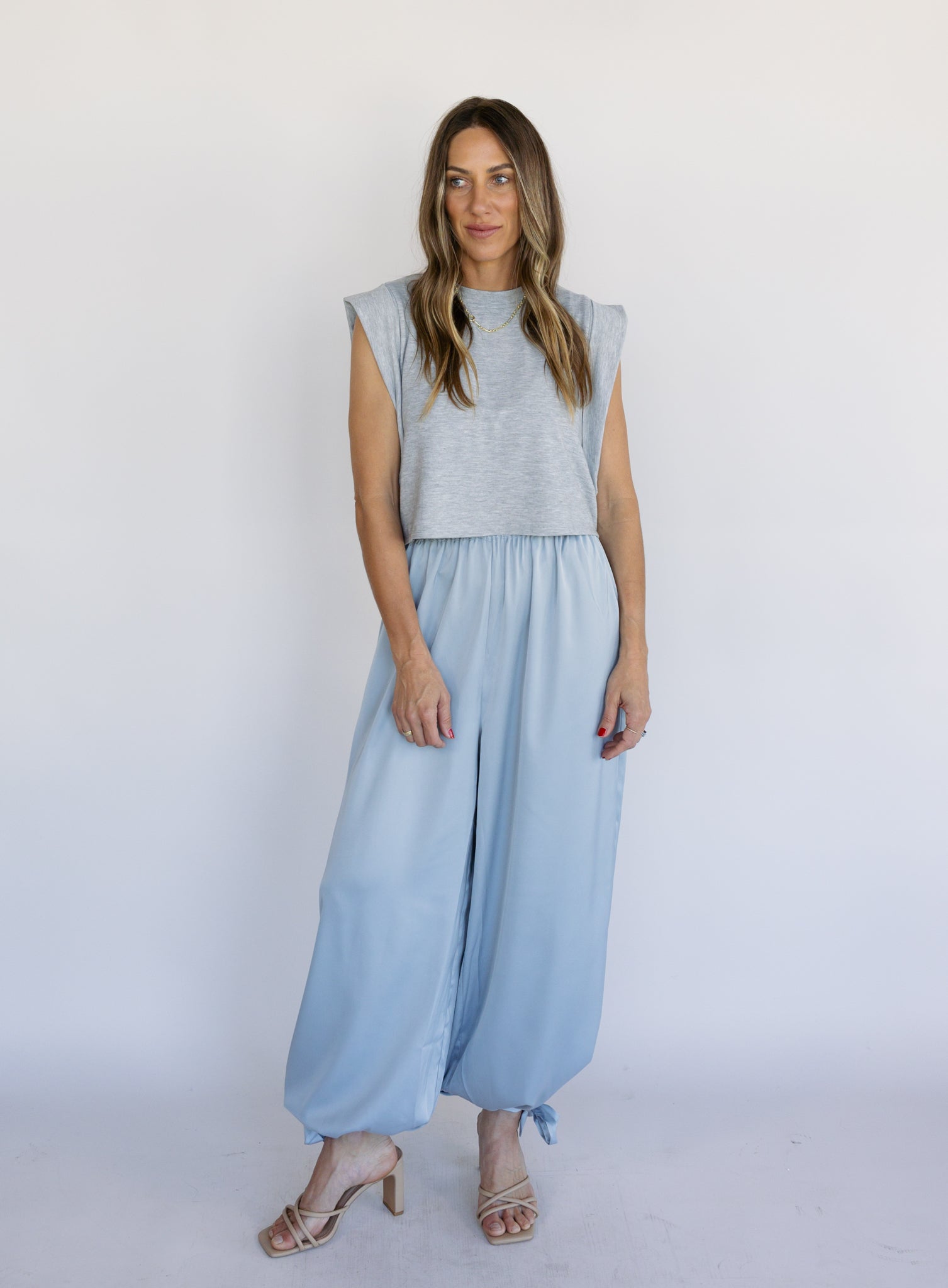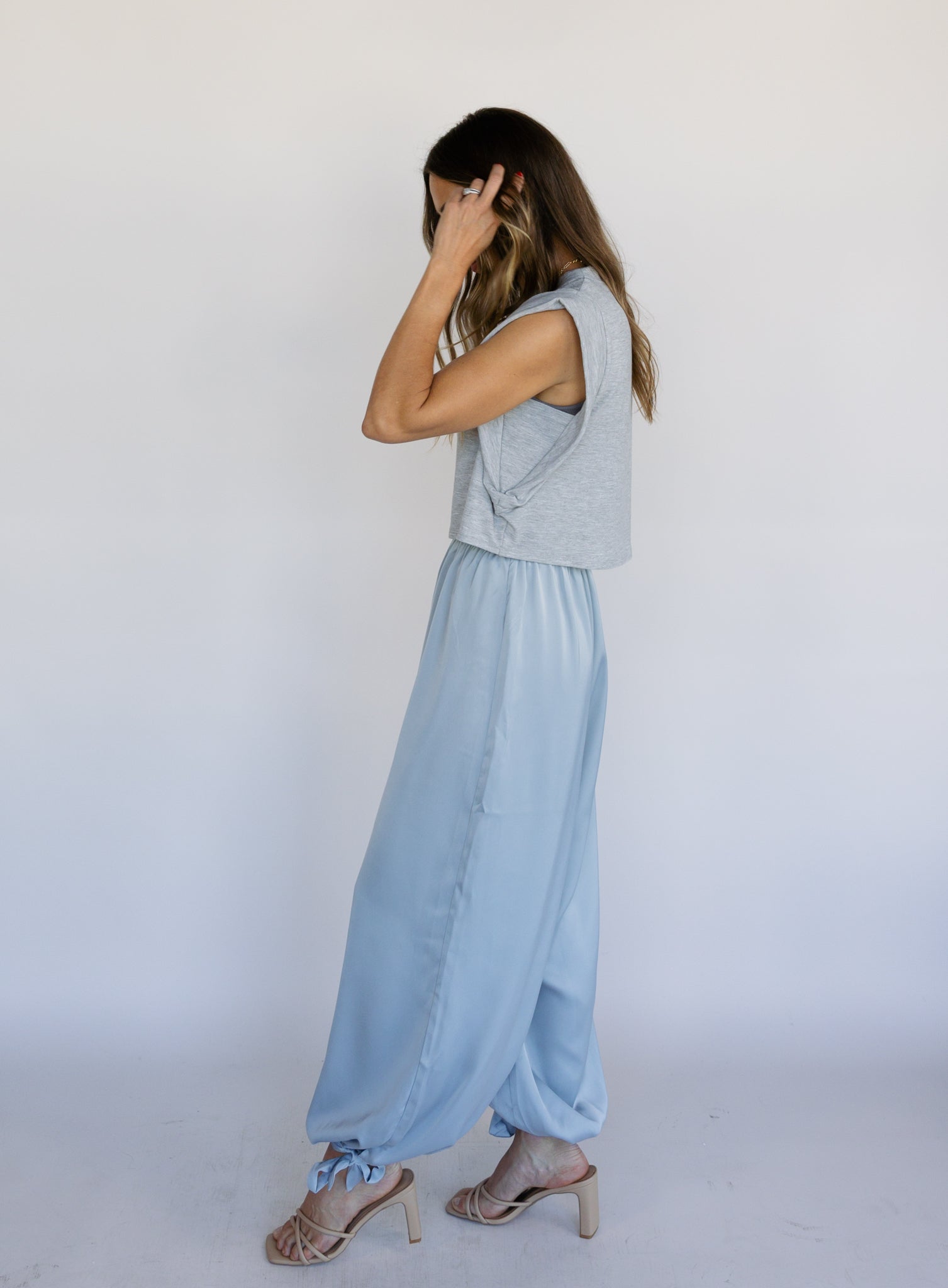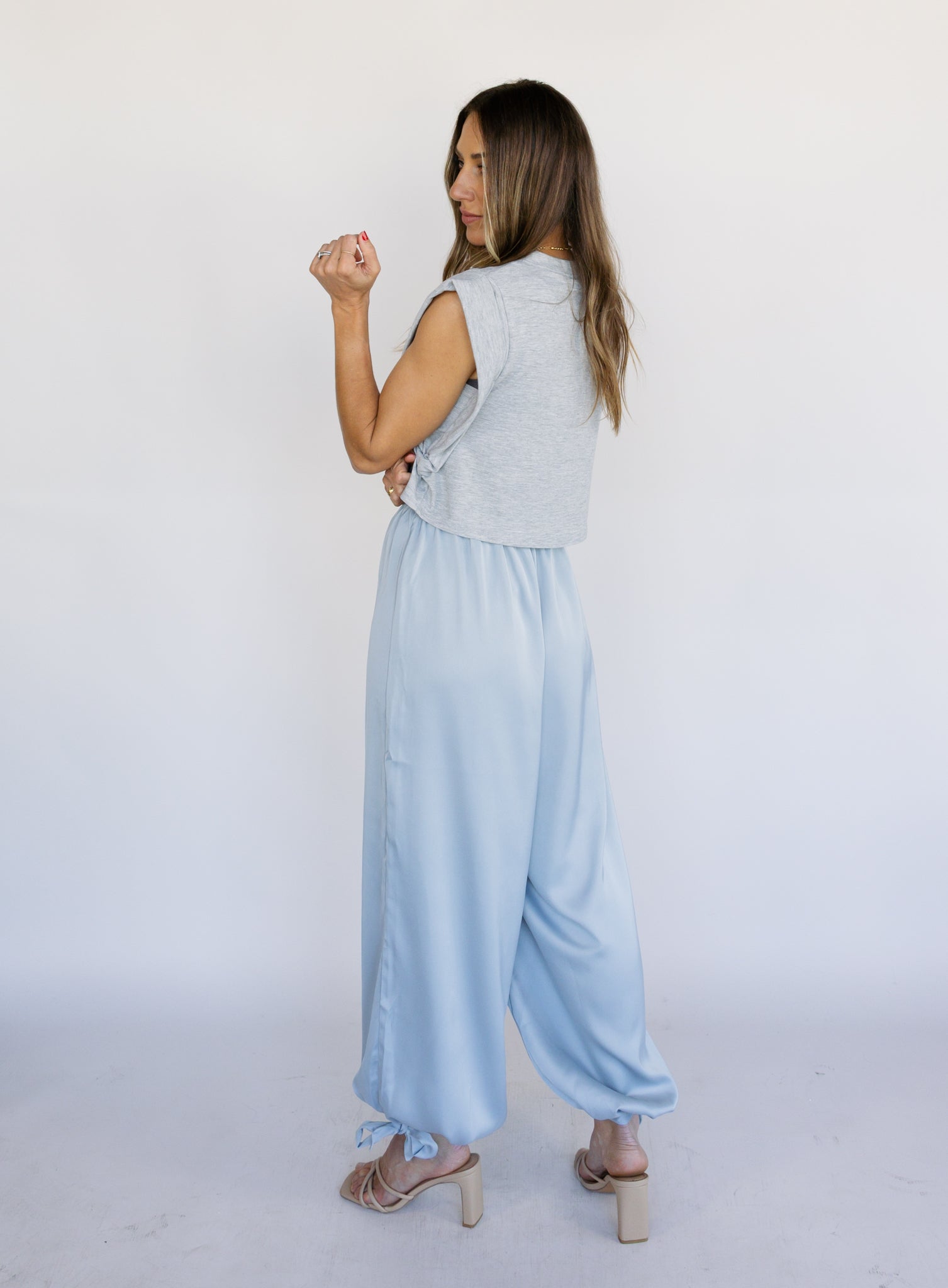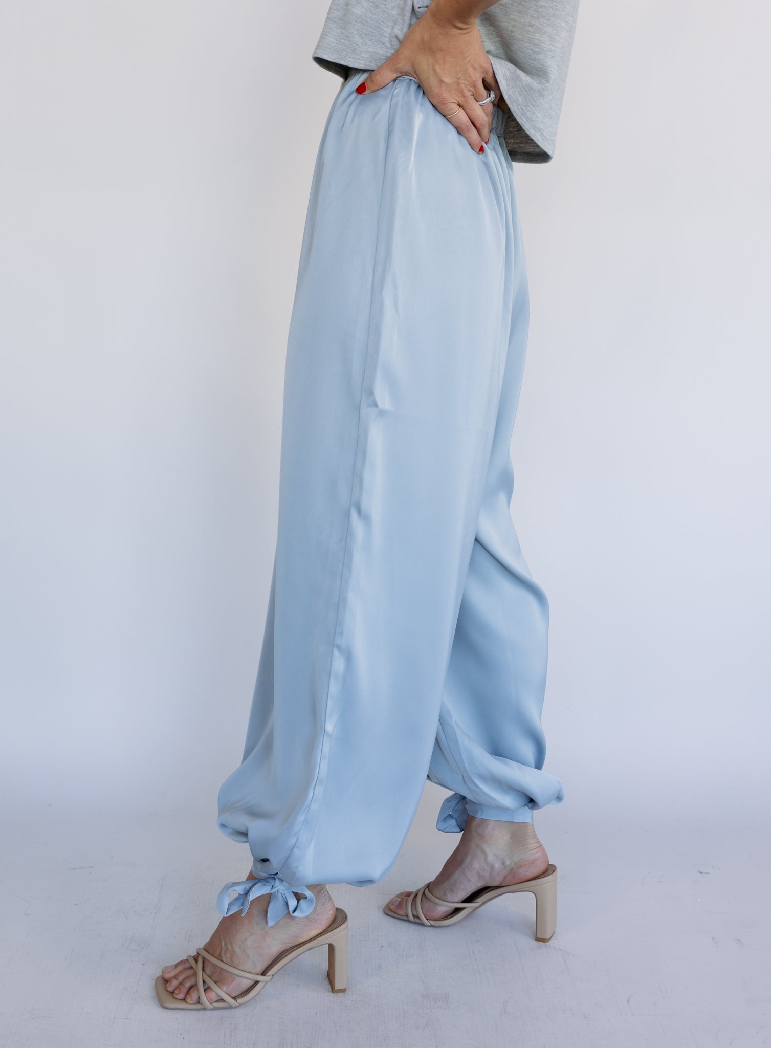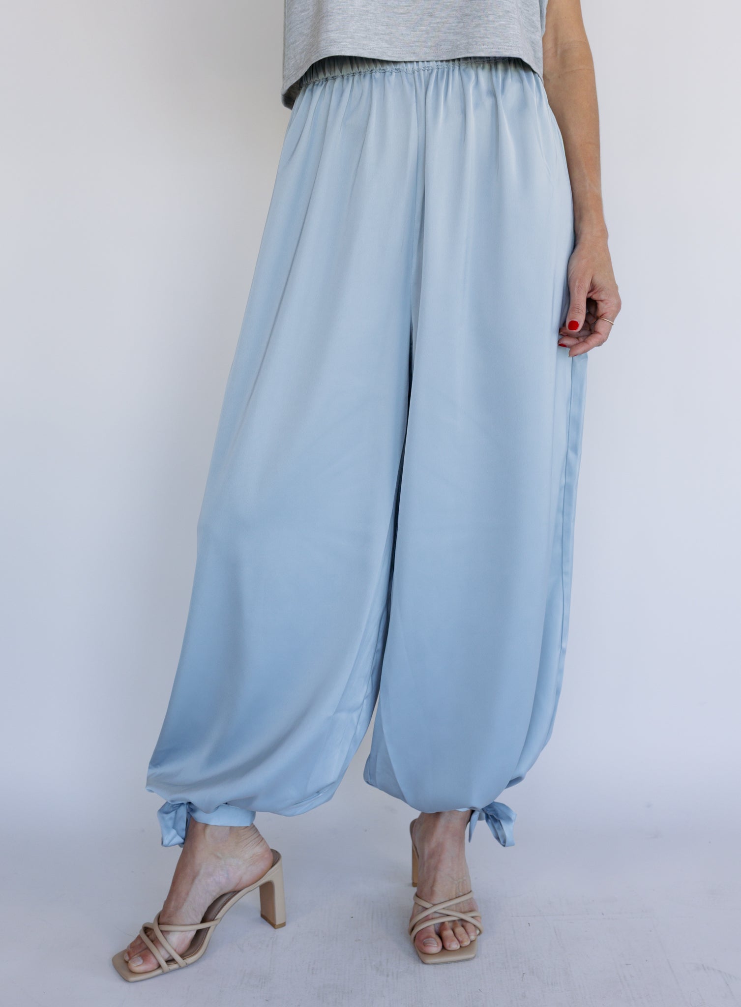 Effortless and statement-making in the best way. The Zuri Satin Balloon Pants feature a soft, fluid satin fabric with a relaxed balloon silhouette that drapes beautifully as you move. The high-rise waist and gathered ankle detail create shape while still keeping the fit easy and comfortable.