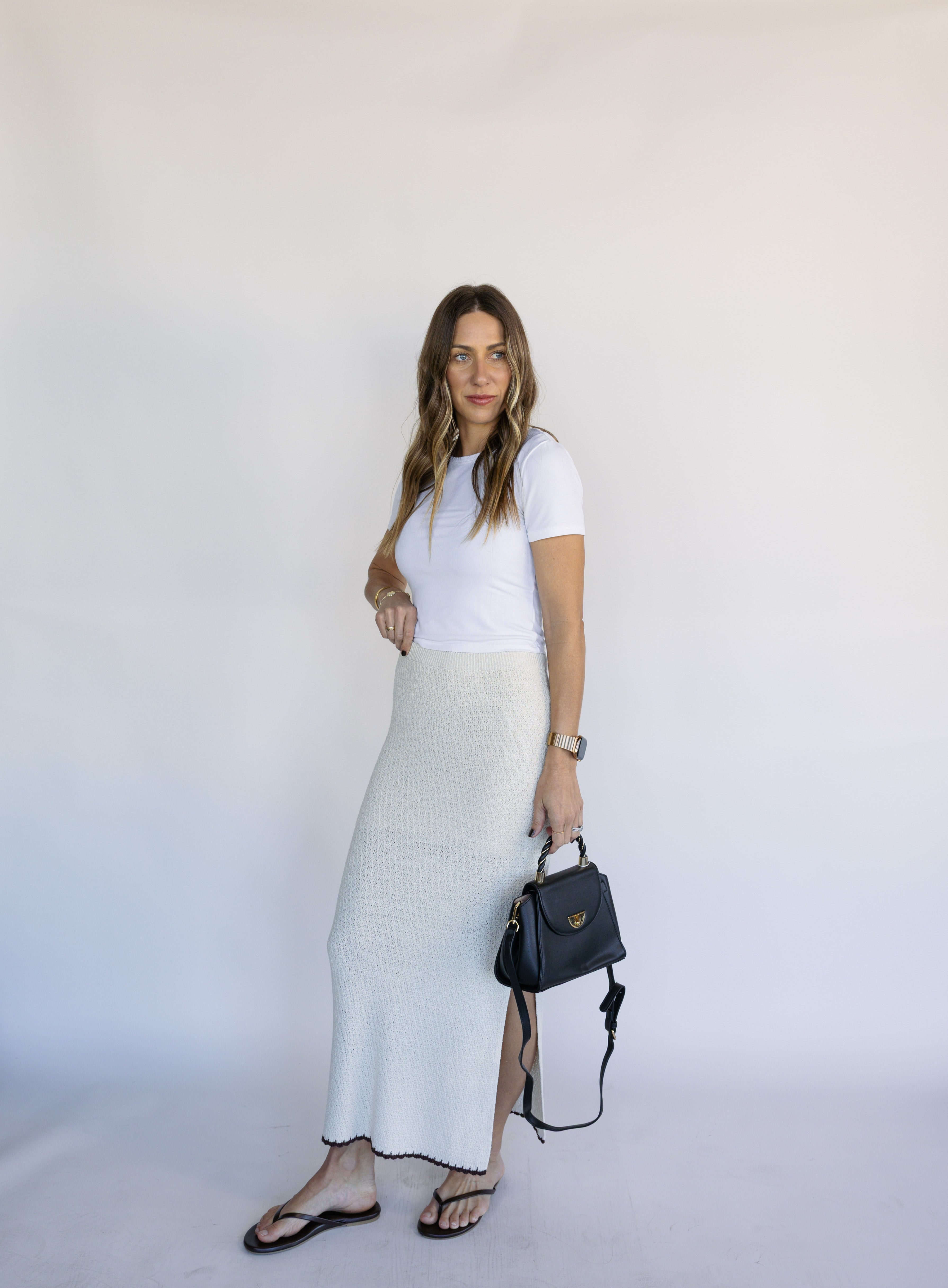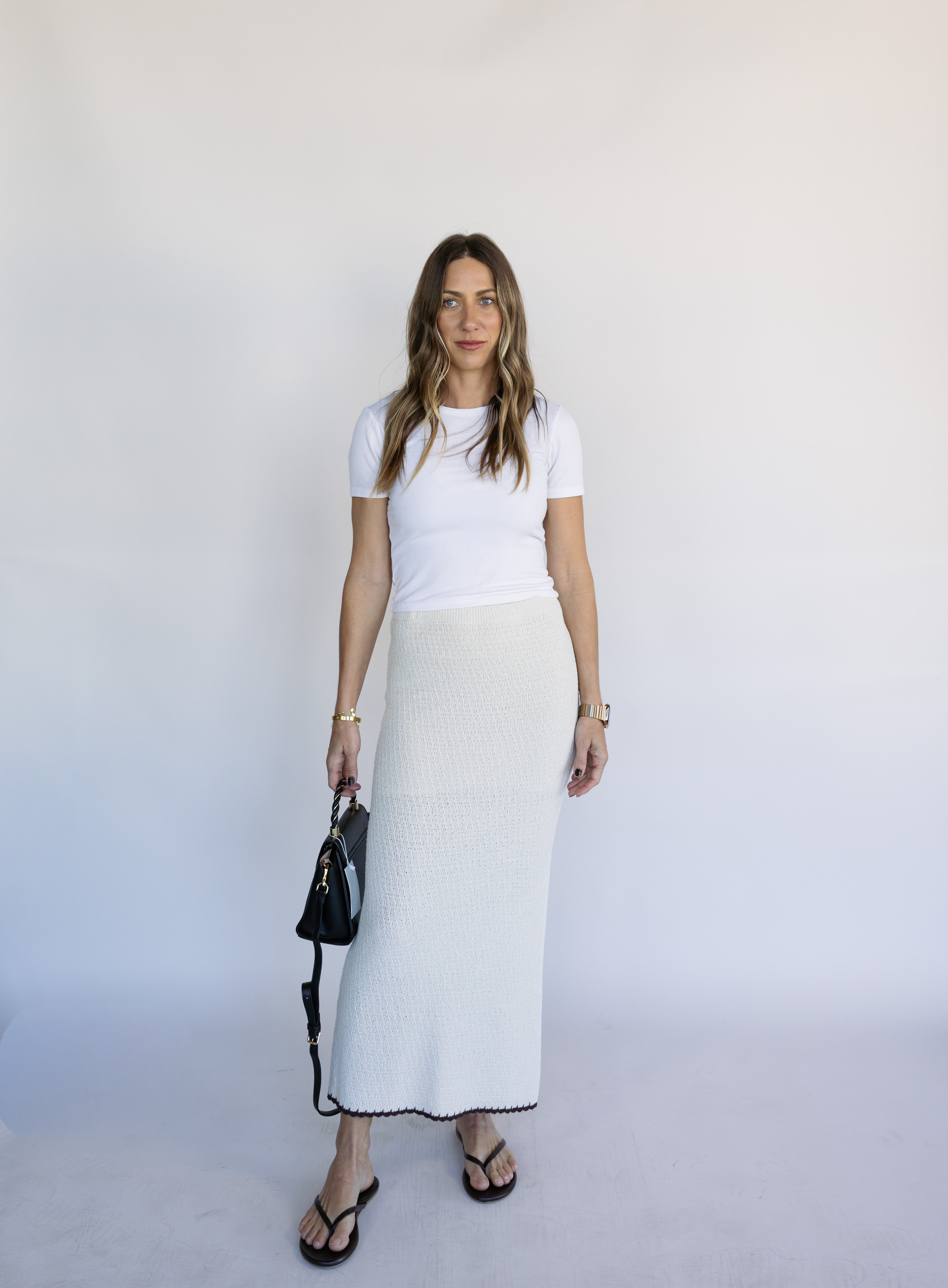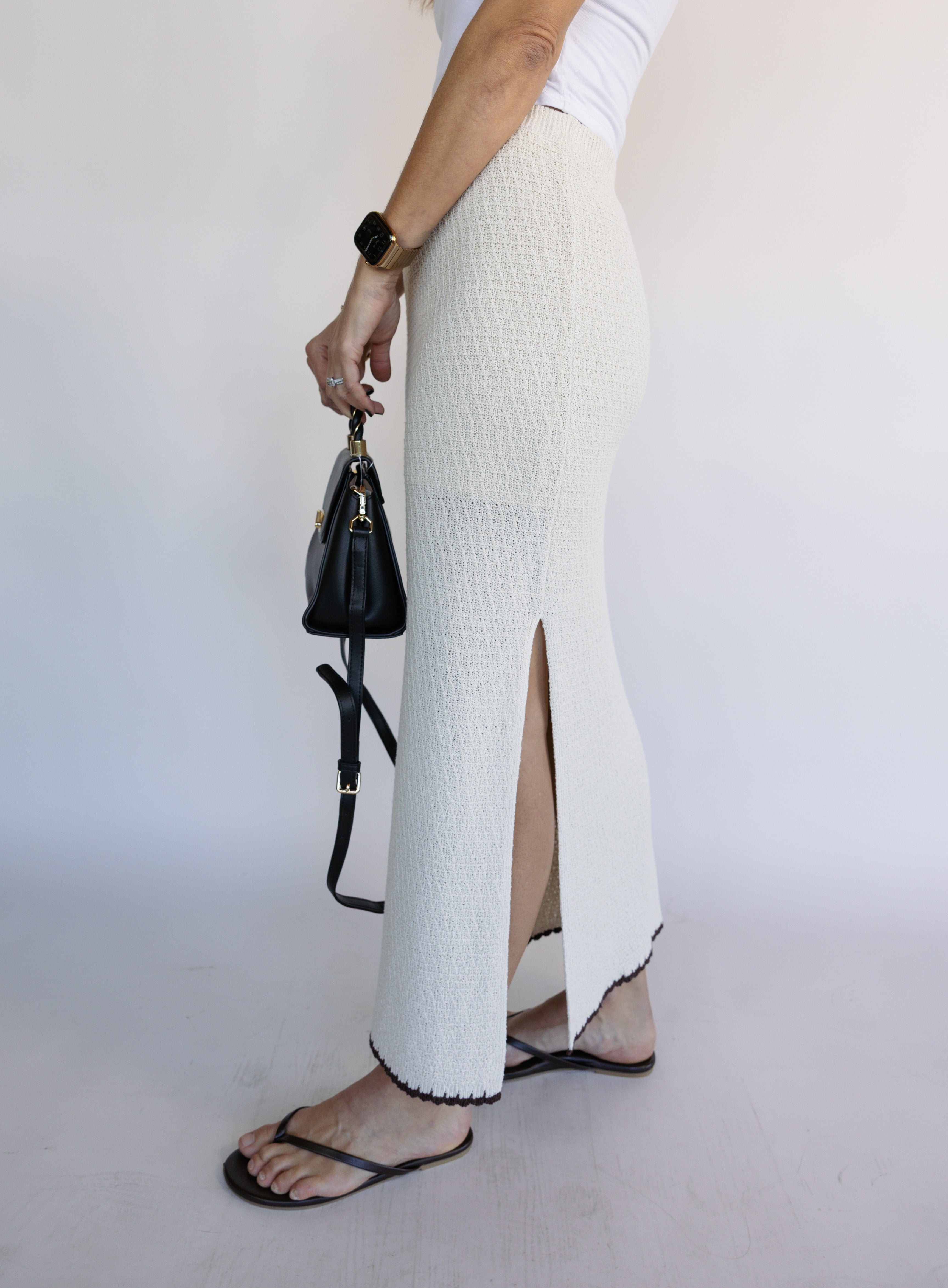 This midi length skirt stands out with contrast color trim, yarn blend fabric, and a flattering silhouette. Make it a set with the Yessenia Whipstitch Tank.