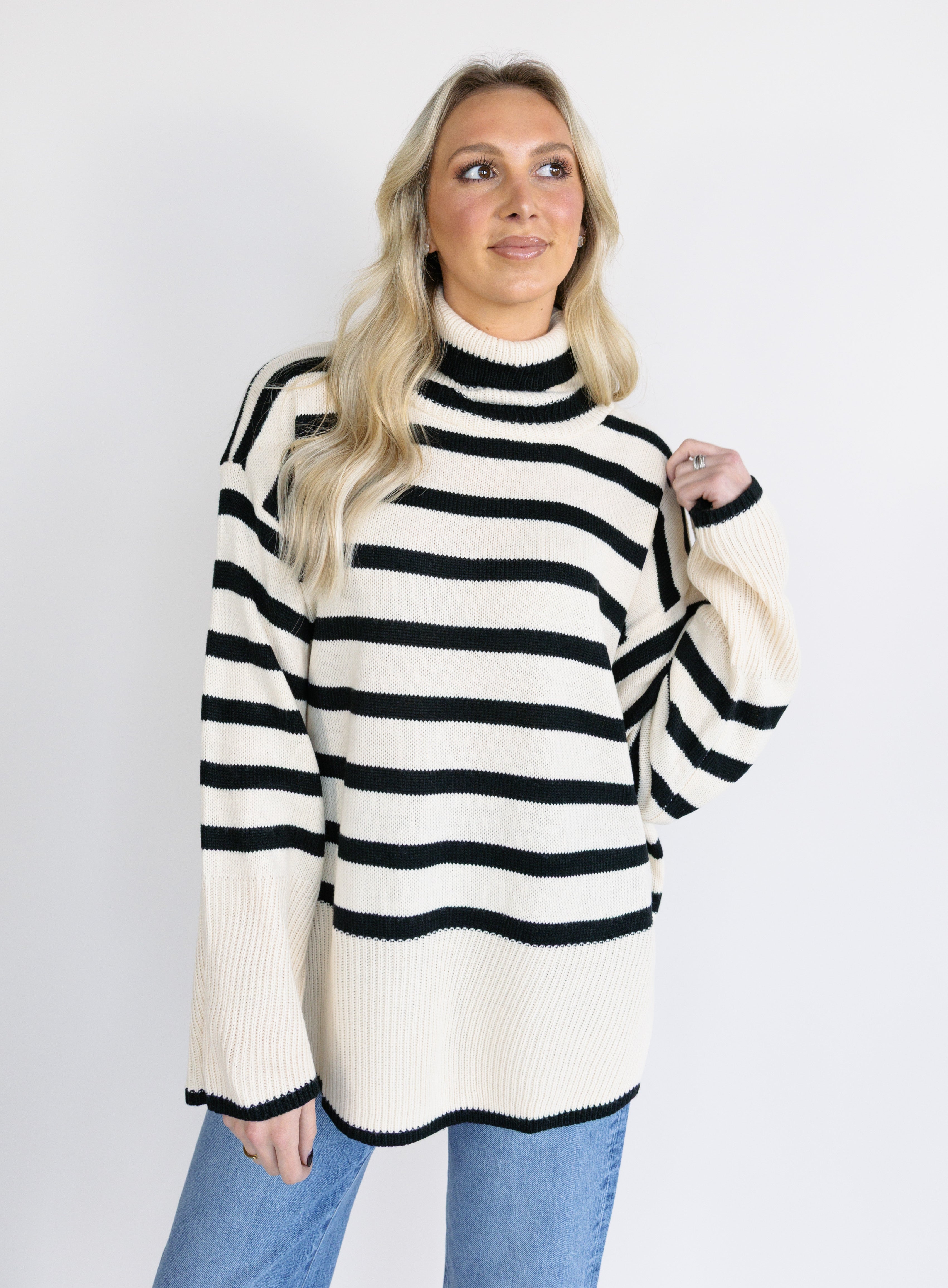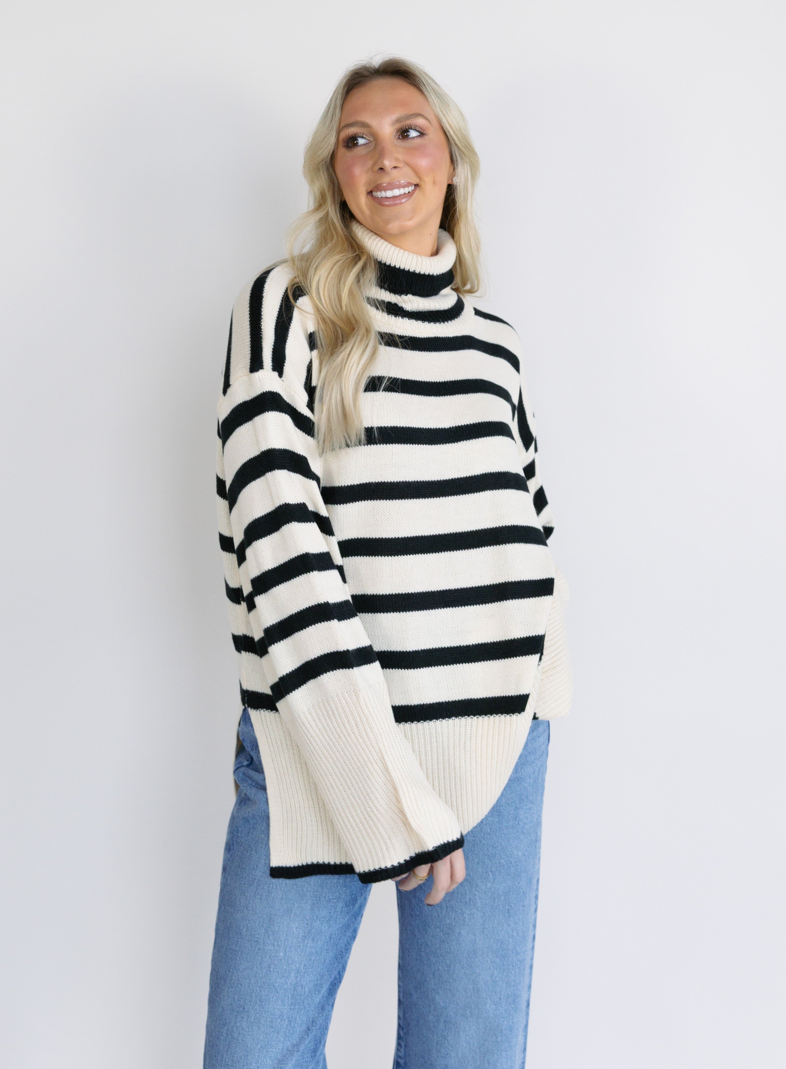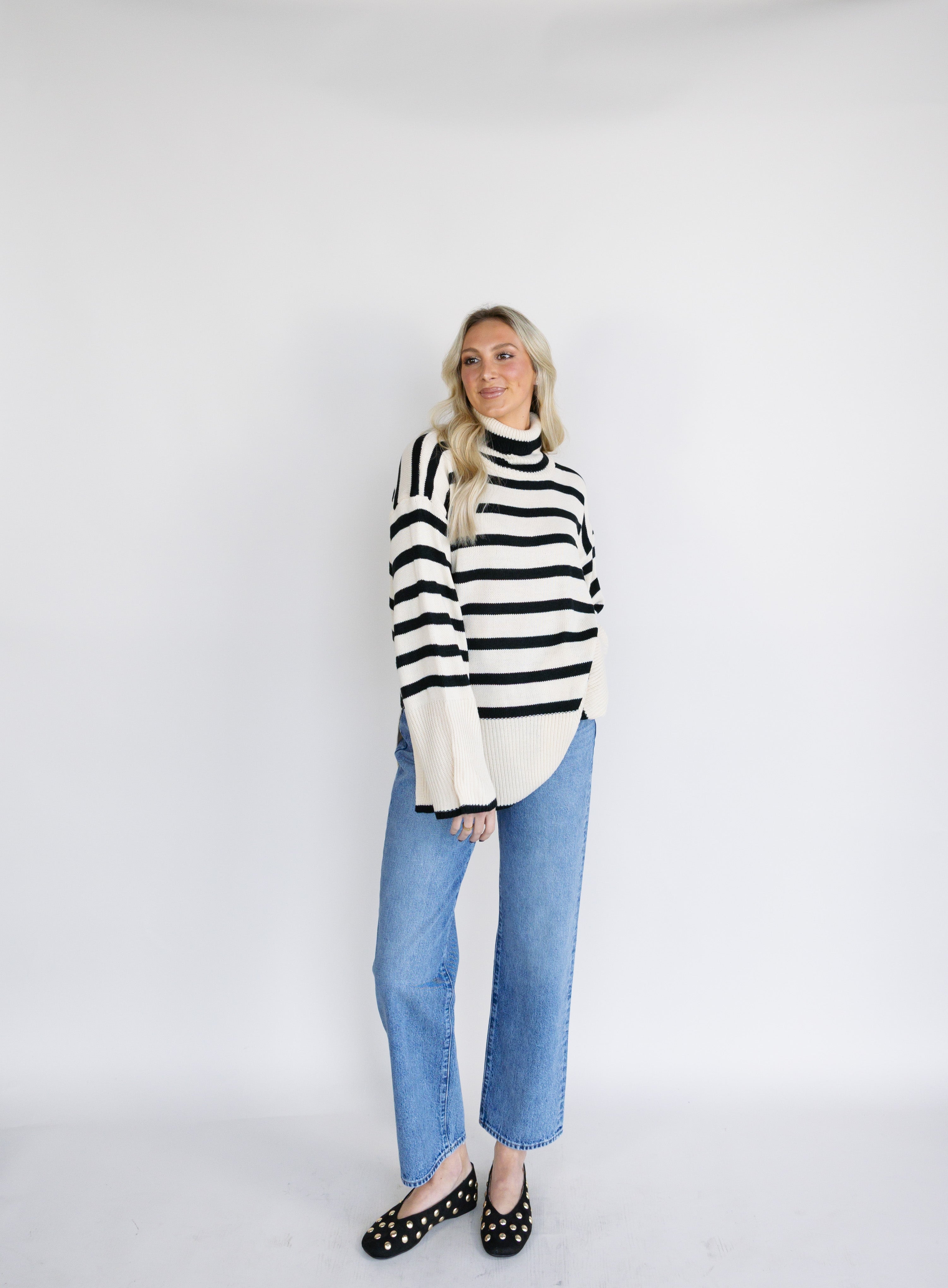 The Line Up Stripe Sweater features a soft knit, relaxed silhouette, and an easy turtle neck — the kind of timeless piece you’ll style on repeat.