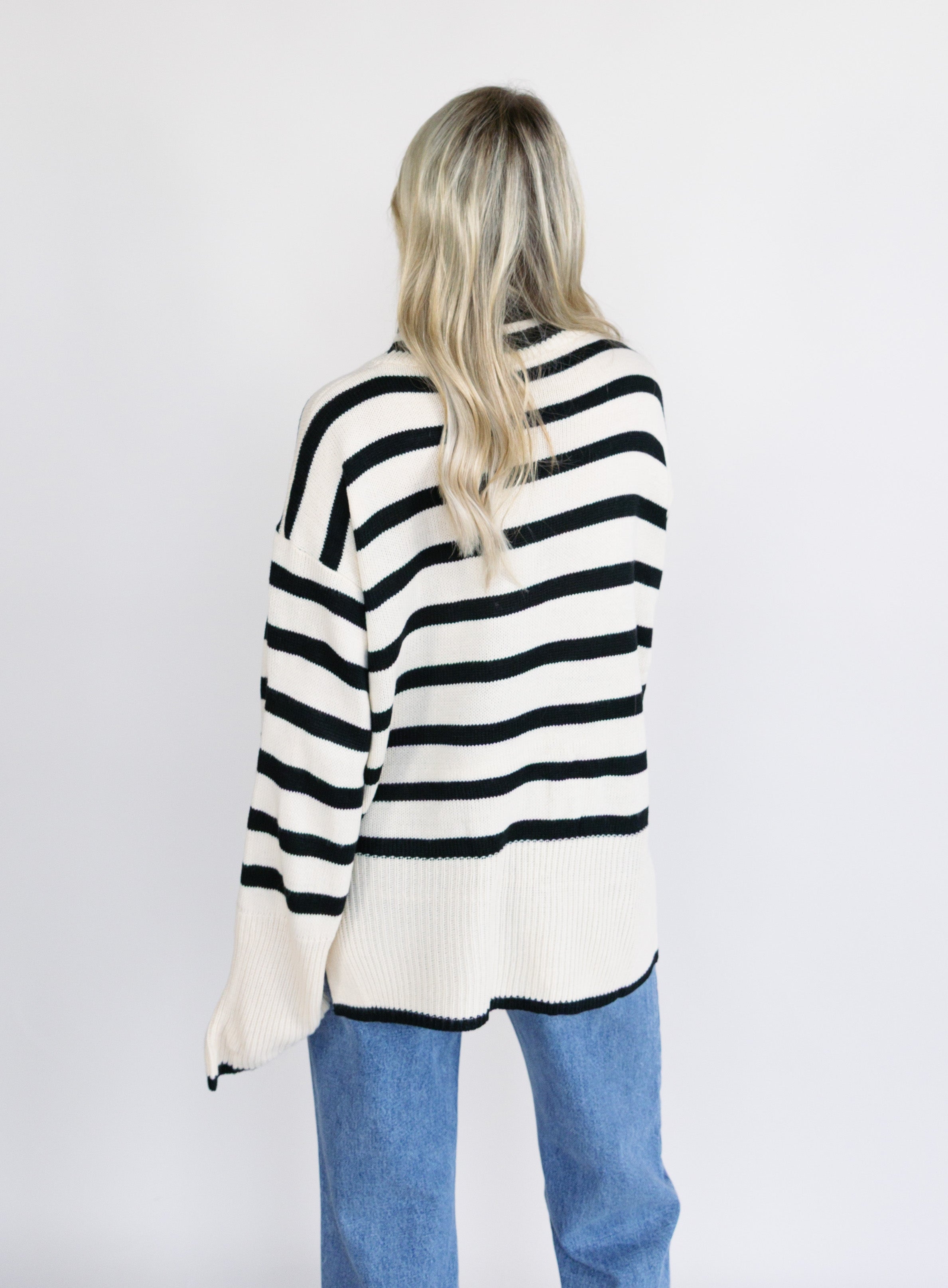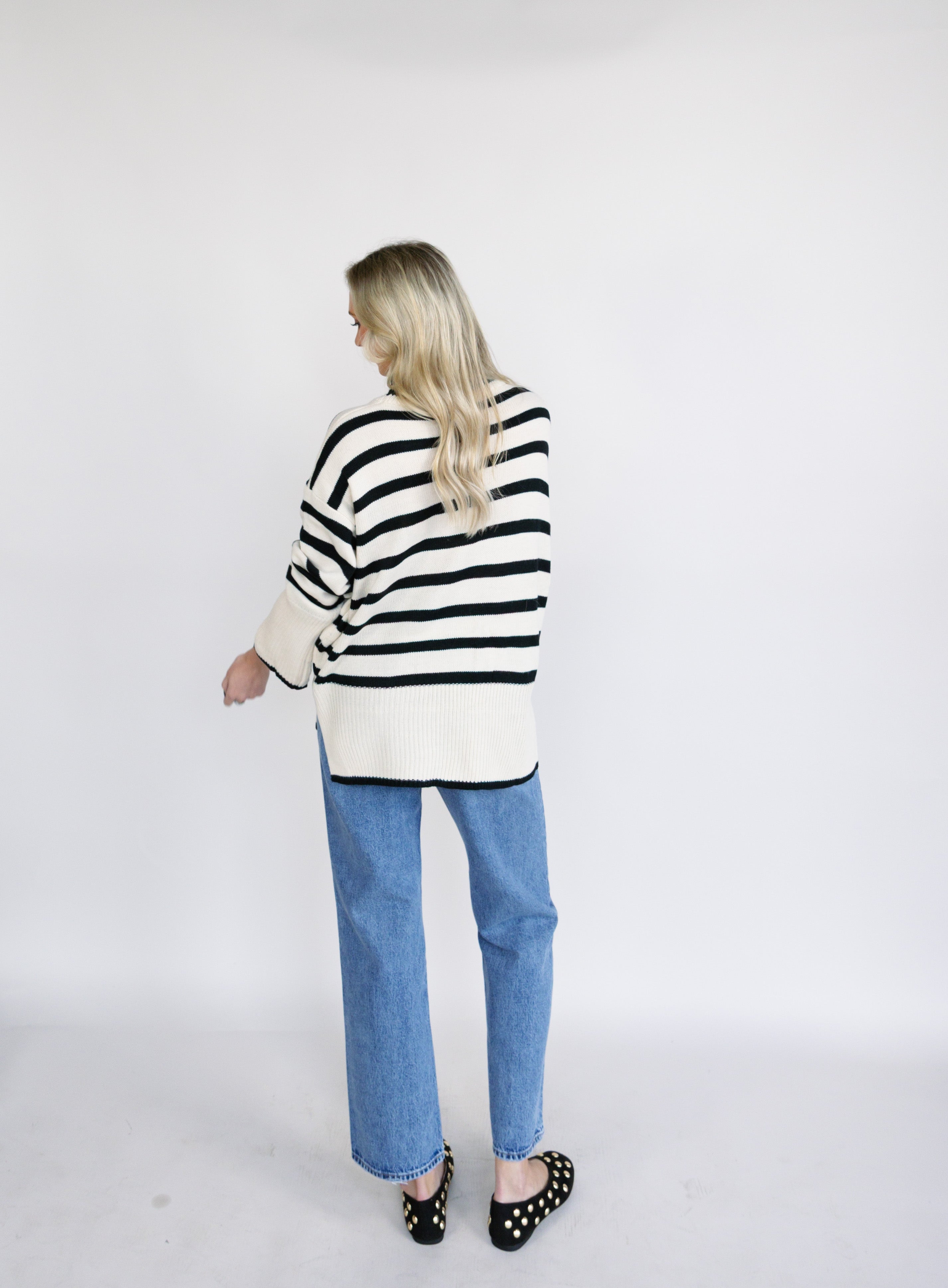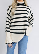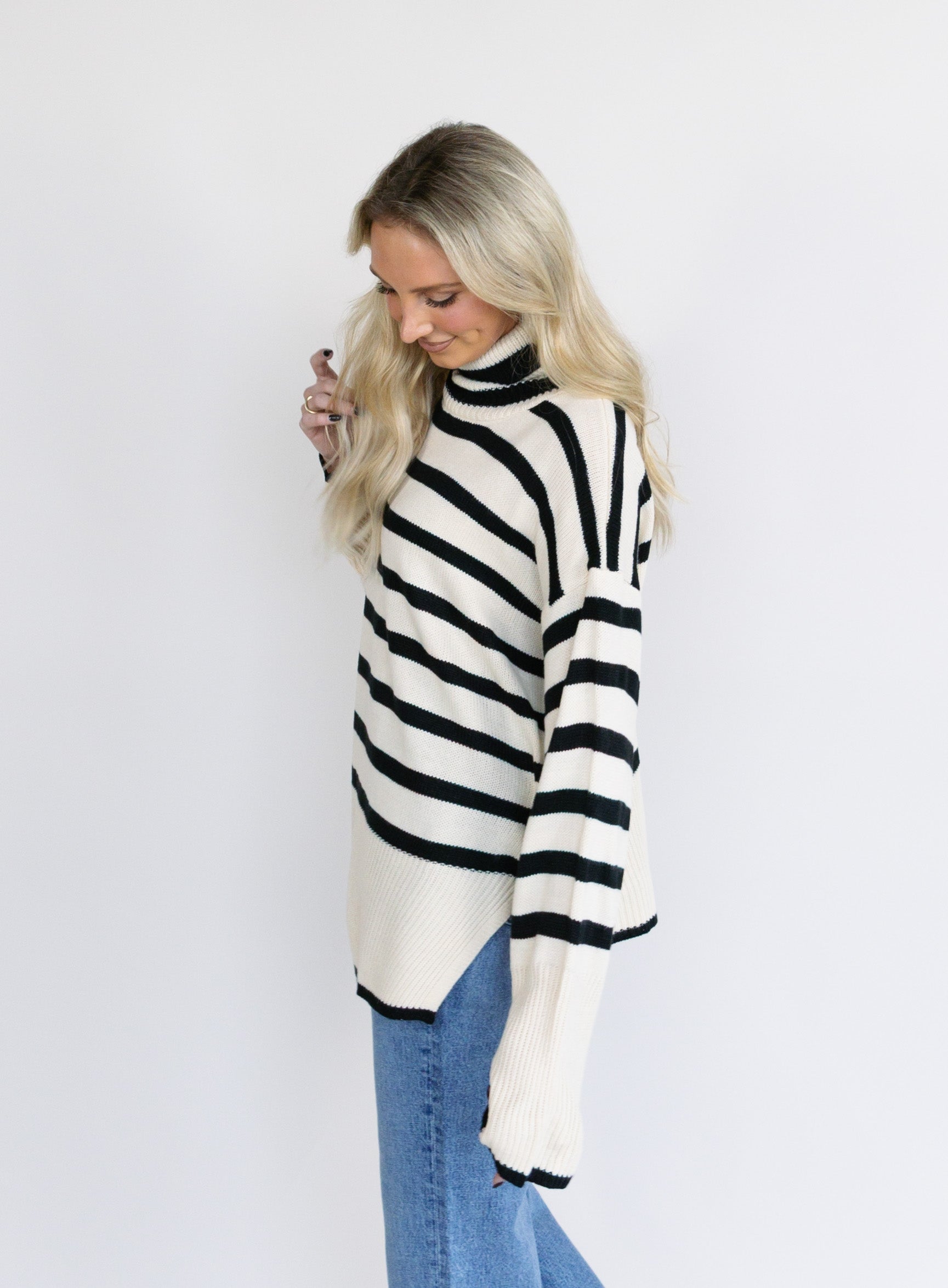 The Line Up Stripe Sweater features a soft knit, relaxed silhouette, and an easy turtle neck — the kind of timeless piece you’ll style on repeat.
