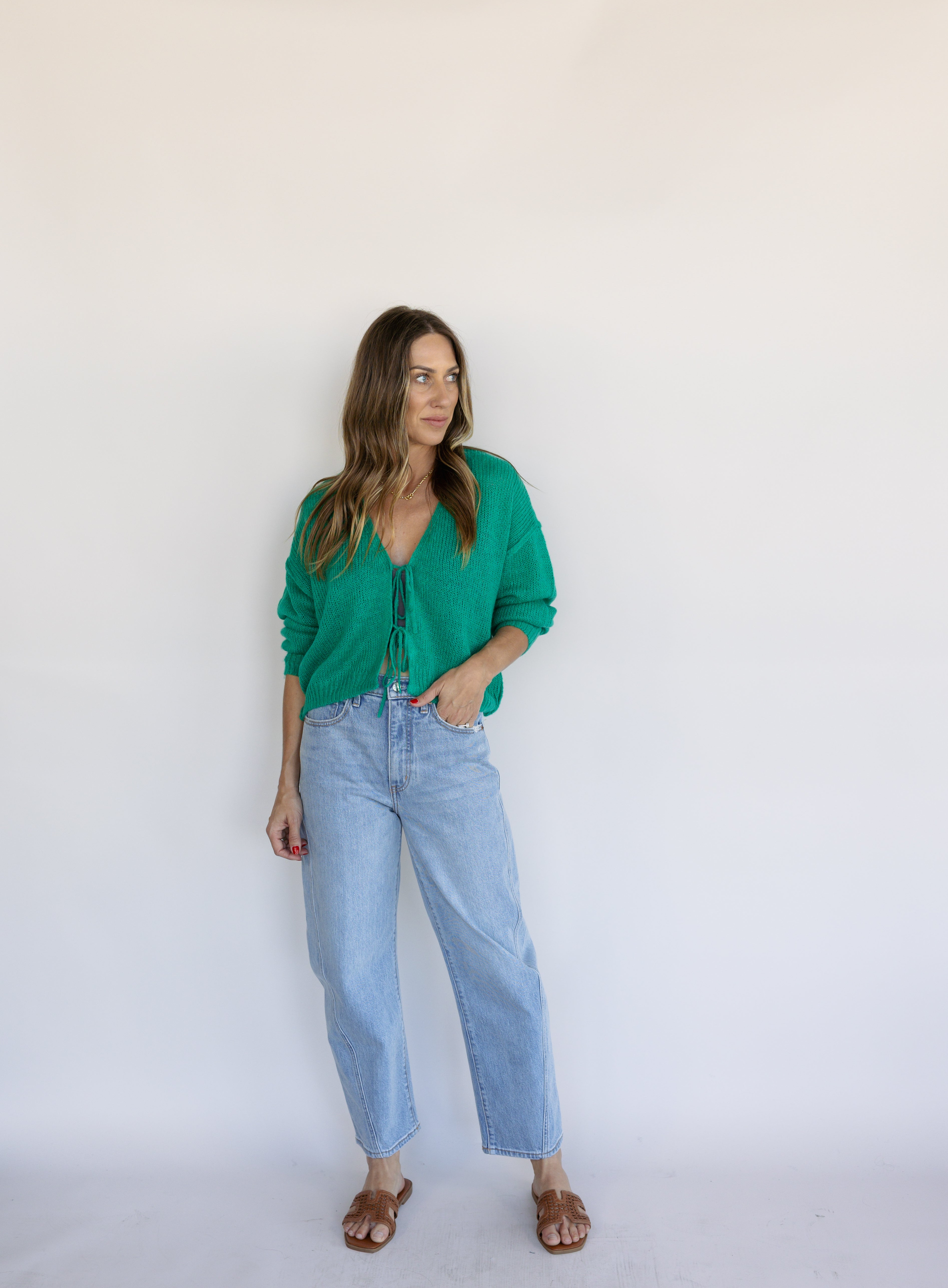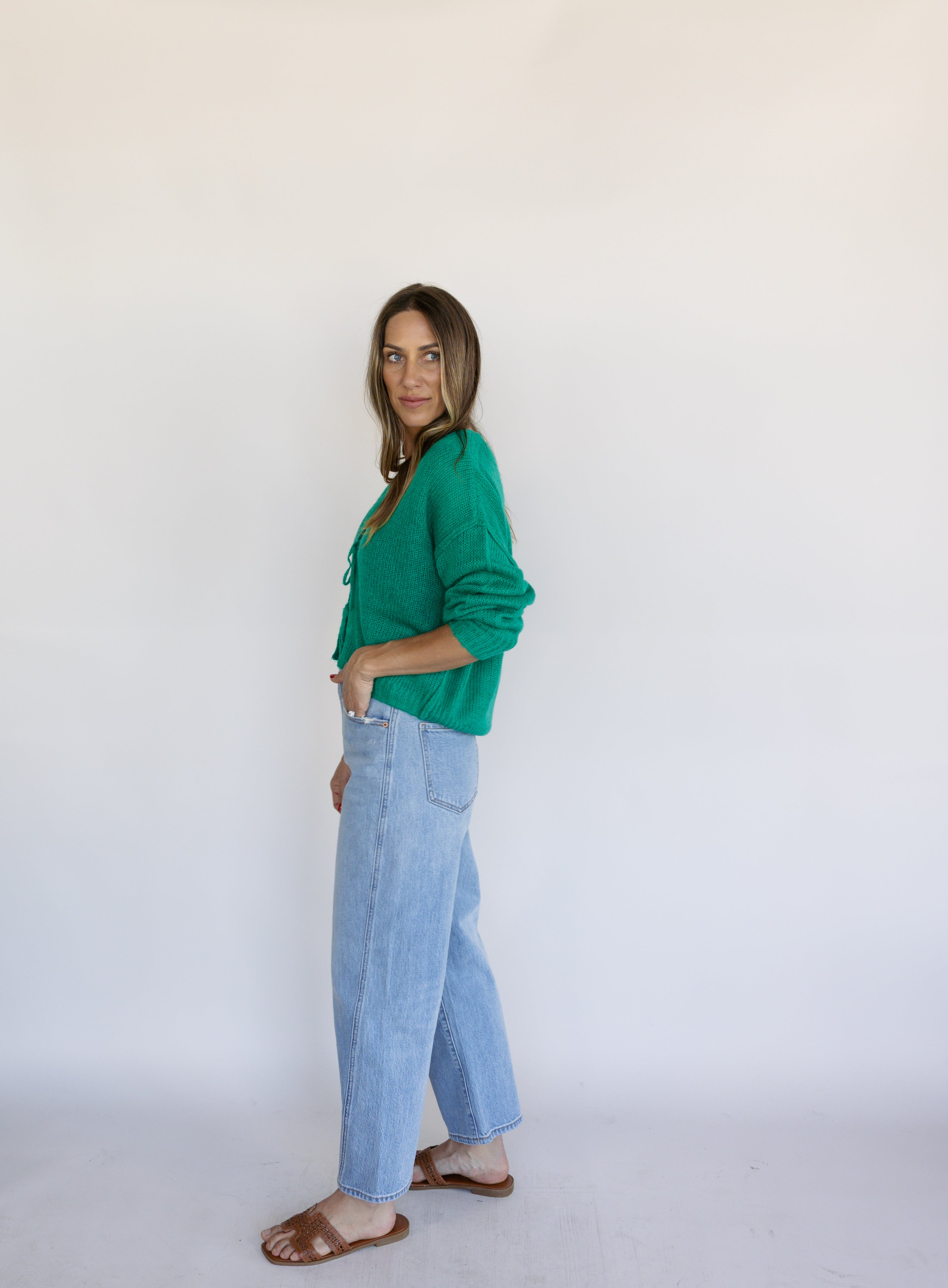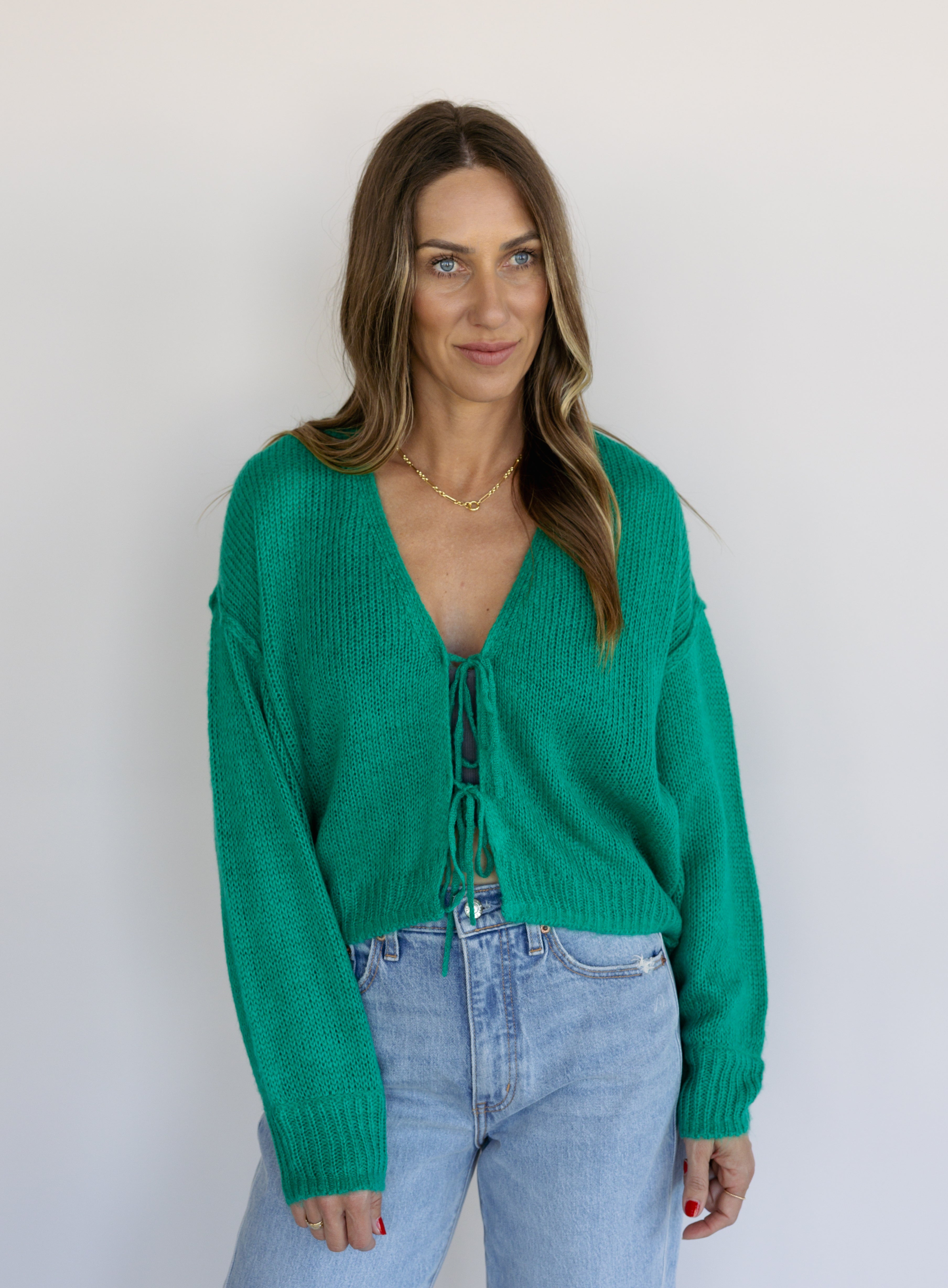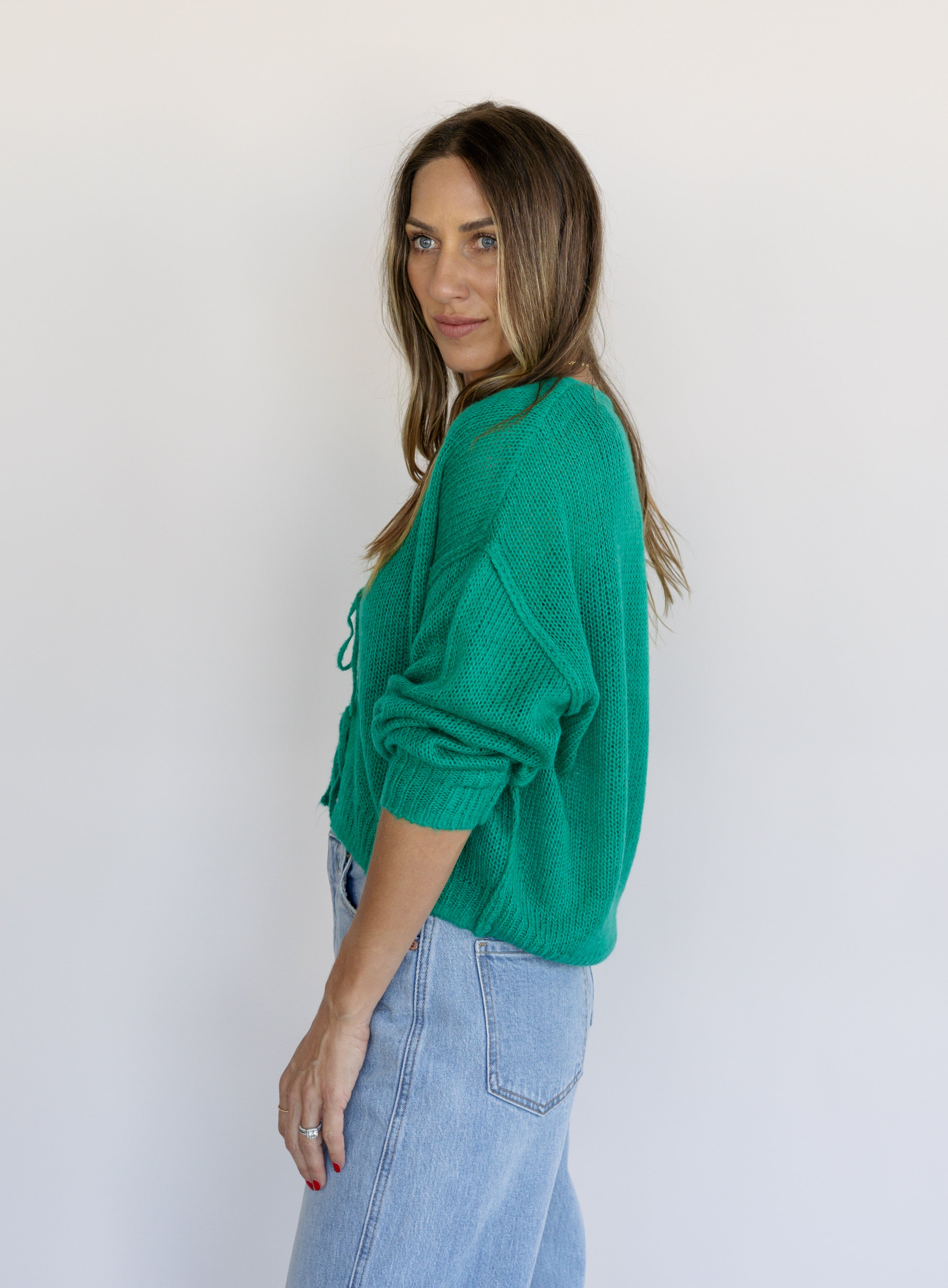 The Ellyn Sweater is your new layering favorite. This tie-front cardigan in rich clover green brings instant polish to any ensemble. Versatile, charming, and endlessly styleable—this piece transitions seamlessly from season to season.