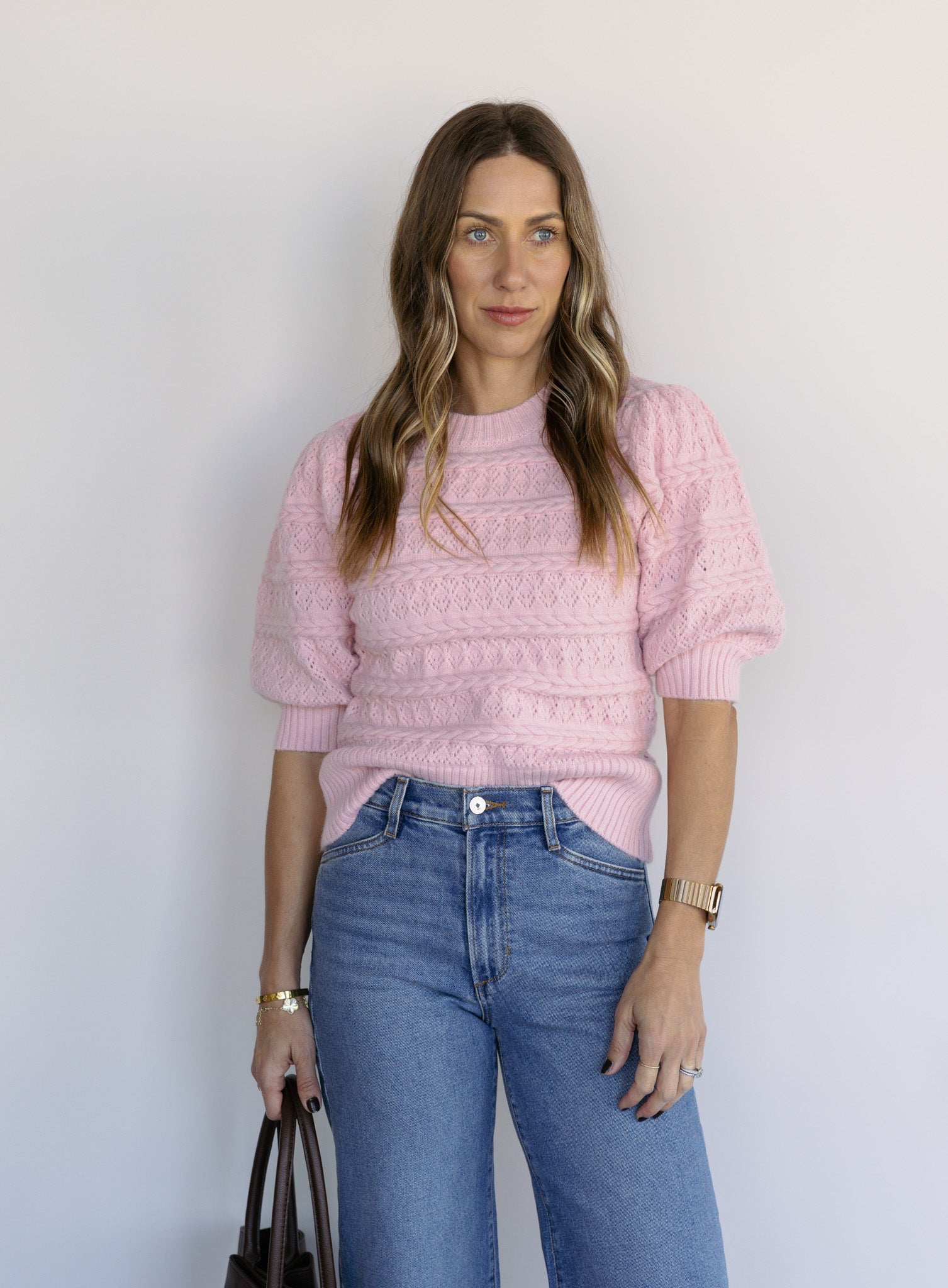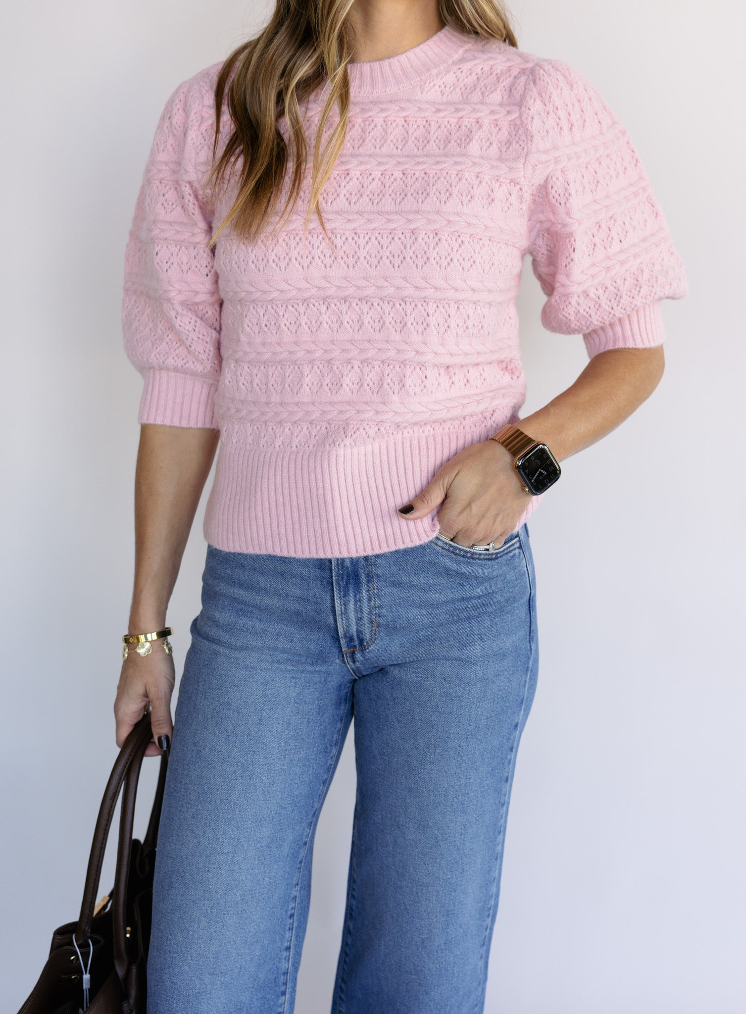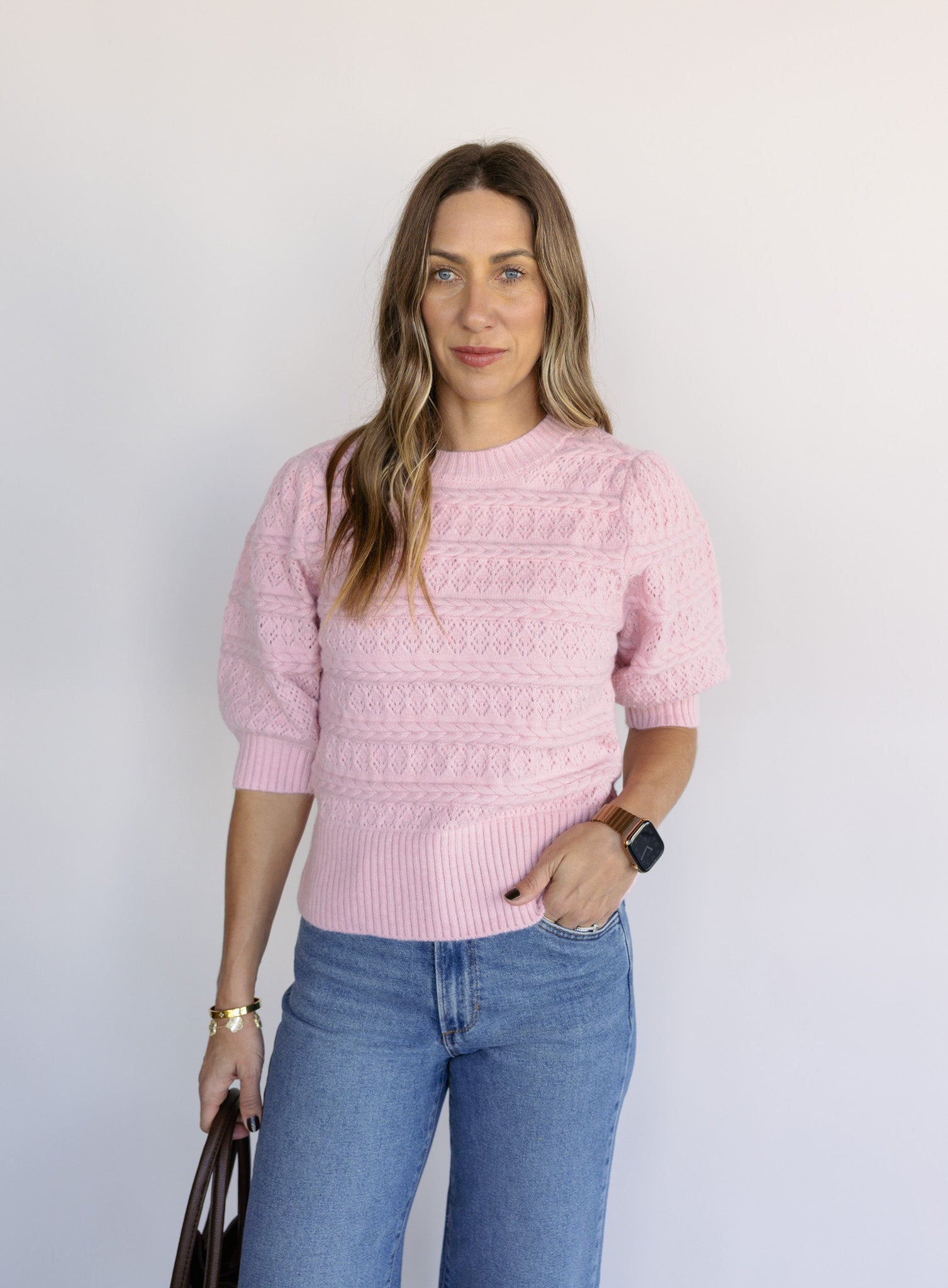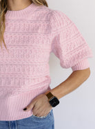 The Rosewood is a soft, feminine knit with delicate cable detailing and an easy short-sleeve silhouette that feels both timeless and fresh. Its blush tone brings a subtle pop of color, making it an effortless choice for everyday wear that still feels thoughtfully styled.