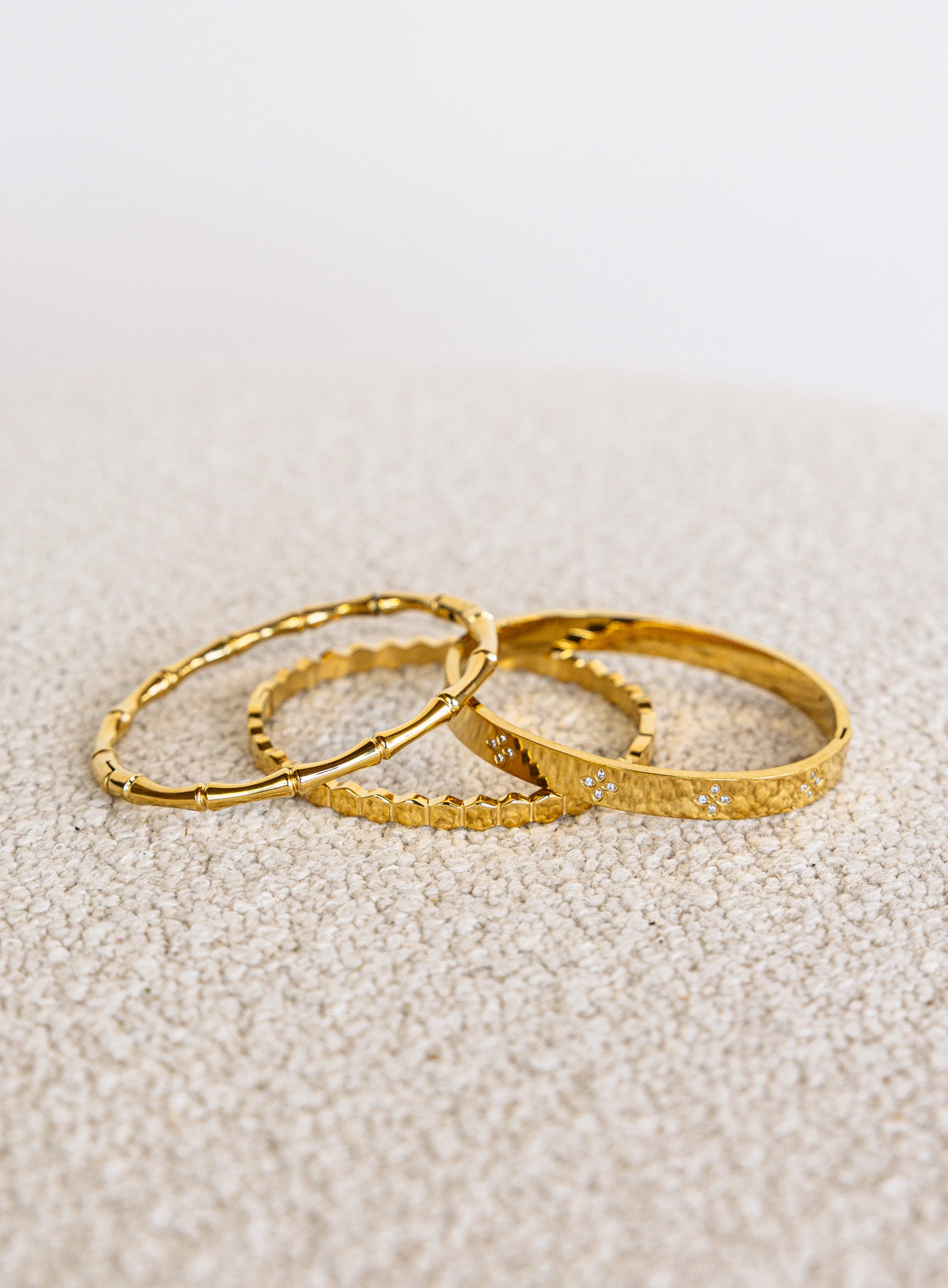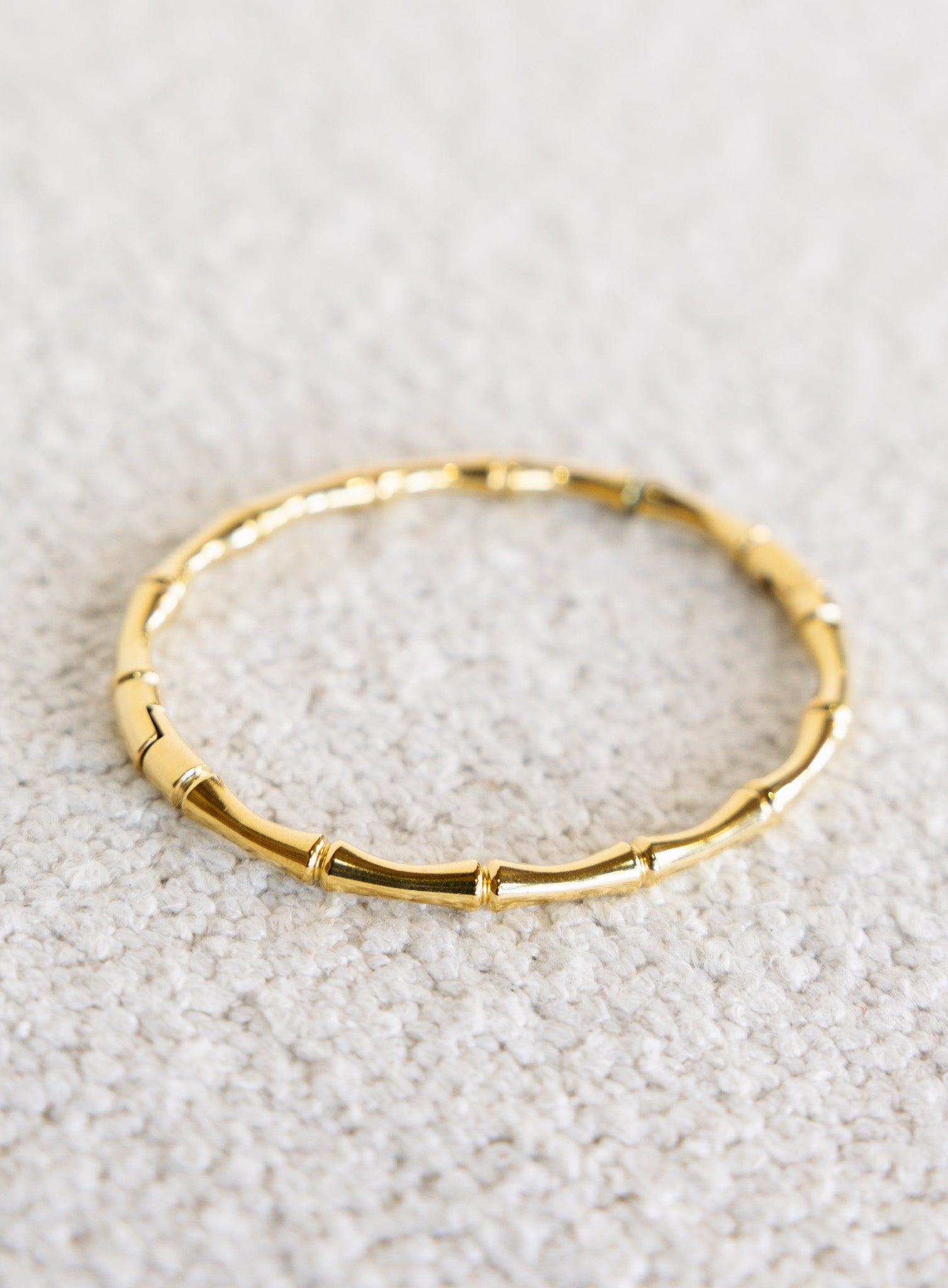 This Bamboo Bracelet is stylishly designed with gold plating, making it perfect for any occasion. Its lightweight design and comfortable fit make it a great accessory to dress up your look! Make a statement with this uniquely eye-catching bracelet!