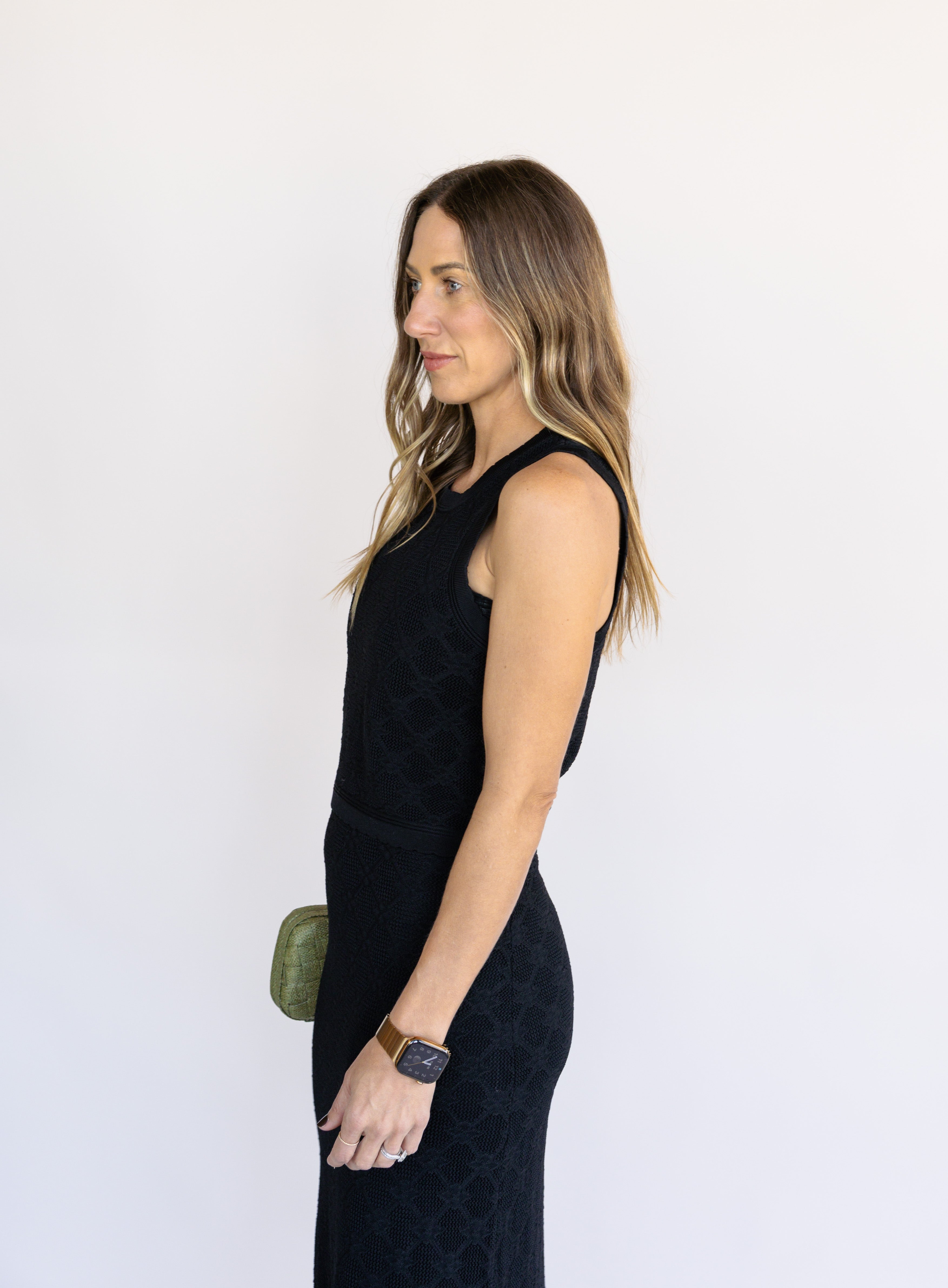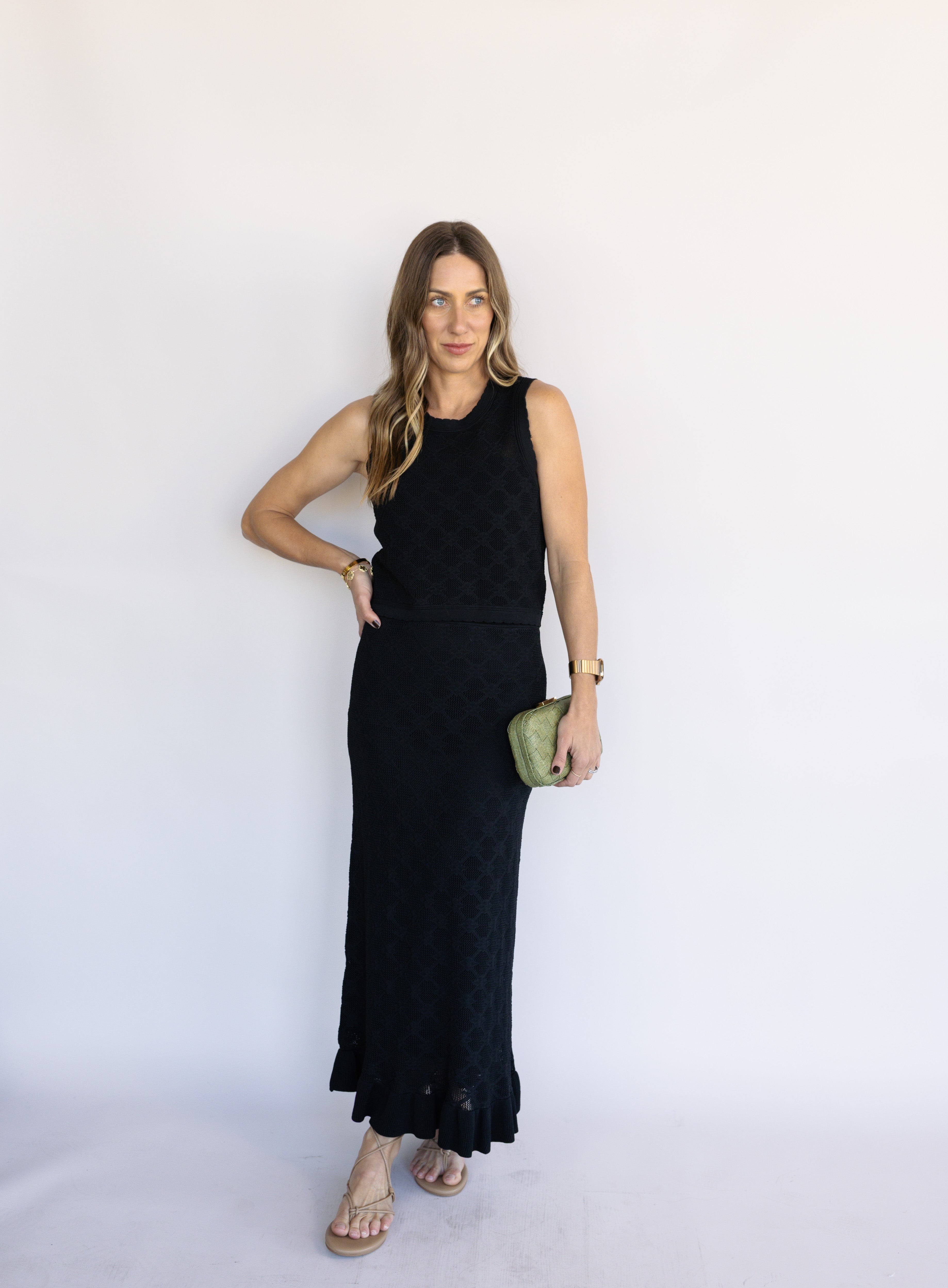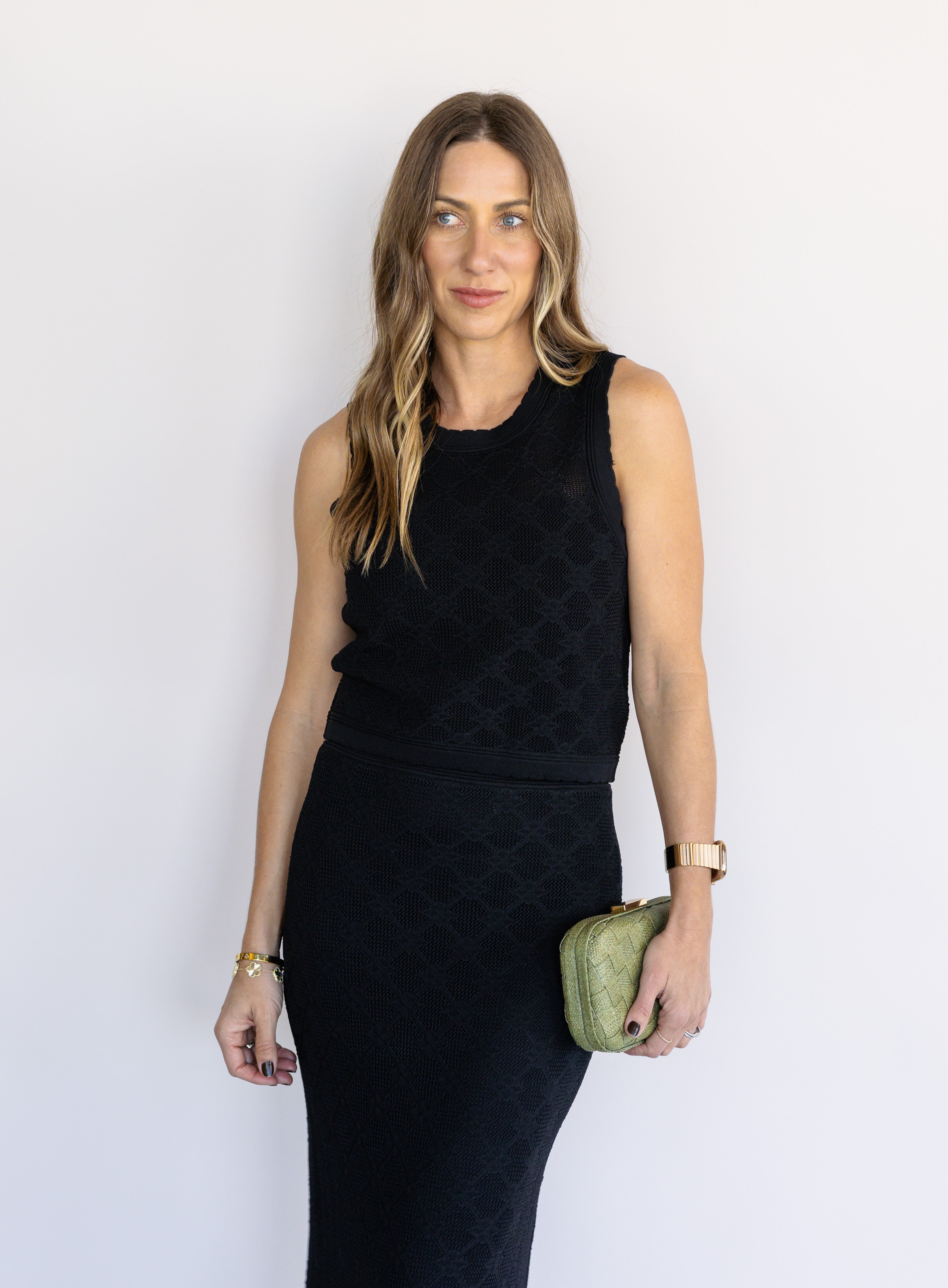 This crewneck tank features a dimension jacquard knit fabric, making it go from day to night effortlessly. Pair it with the Ramona Sweater Skirt for a perfect look.